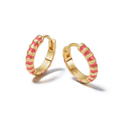 A subtle pop of colour to inspire your jewellery game. Crafted in 18ct gold plate these joyful huggie hoops feature fine coral enamel stripes. A unique addition to any ear stack.
