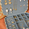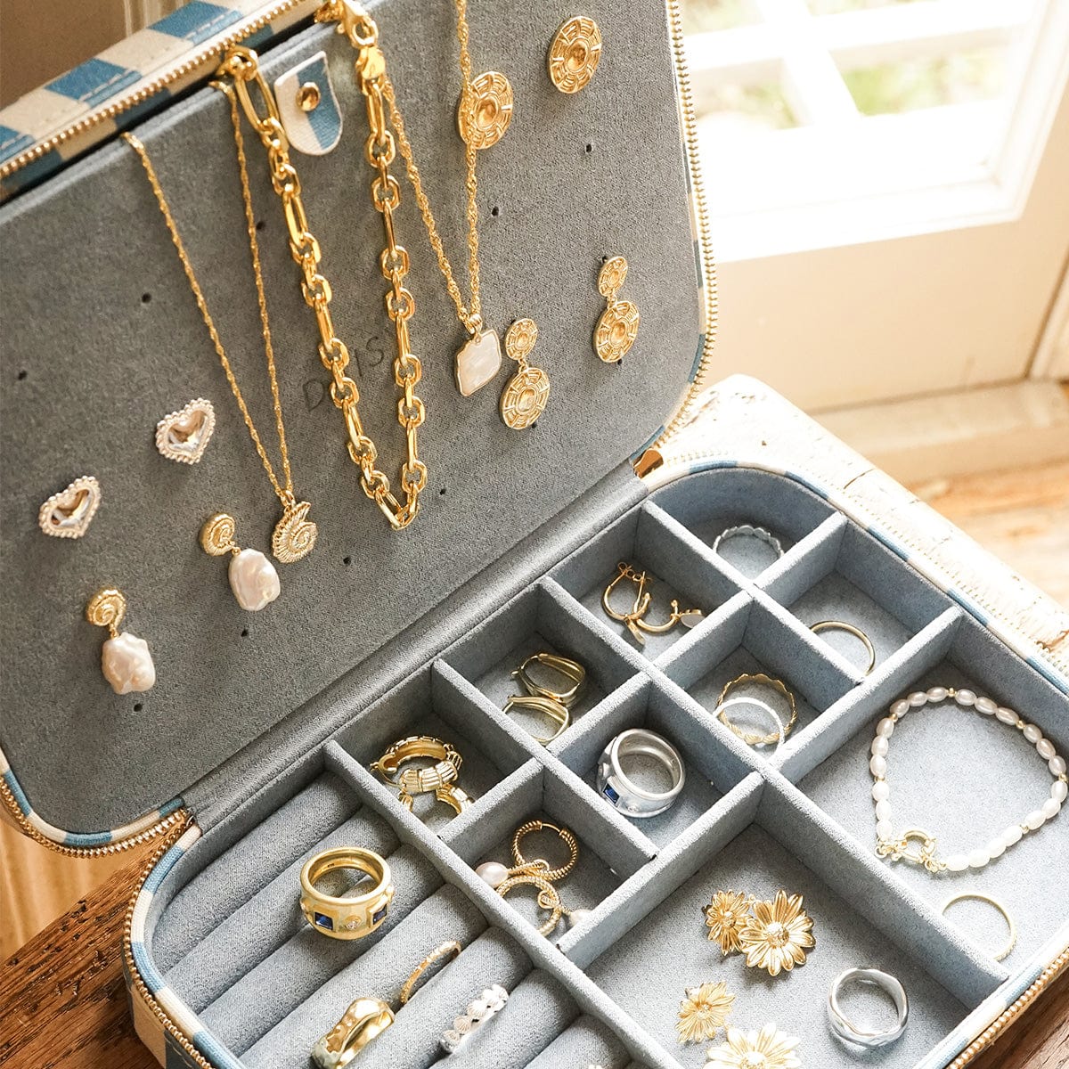 Give your Daisy pieces the best possible home with our latest jewellery case. Perfect for those longer getaways or sitting pretty on your dressing table. Measuring 24x17x6cm, this case has space for necklaces, rings, hoop earrings, bracelets and a whole section for studs. Your jewellery storage just got upgraded, and we're here for it.