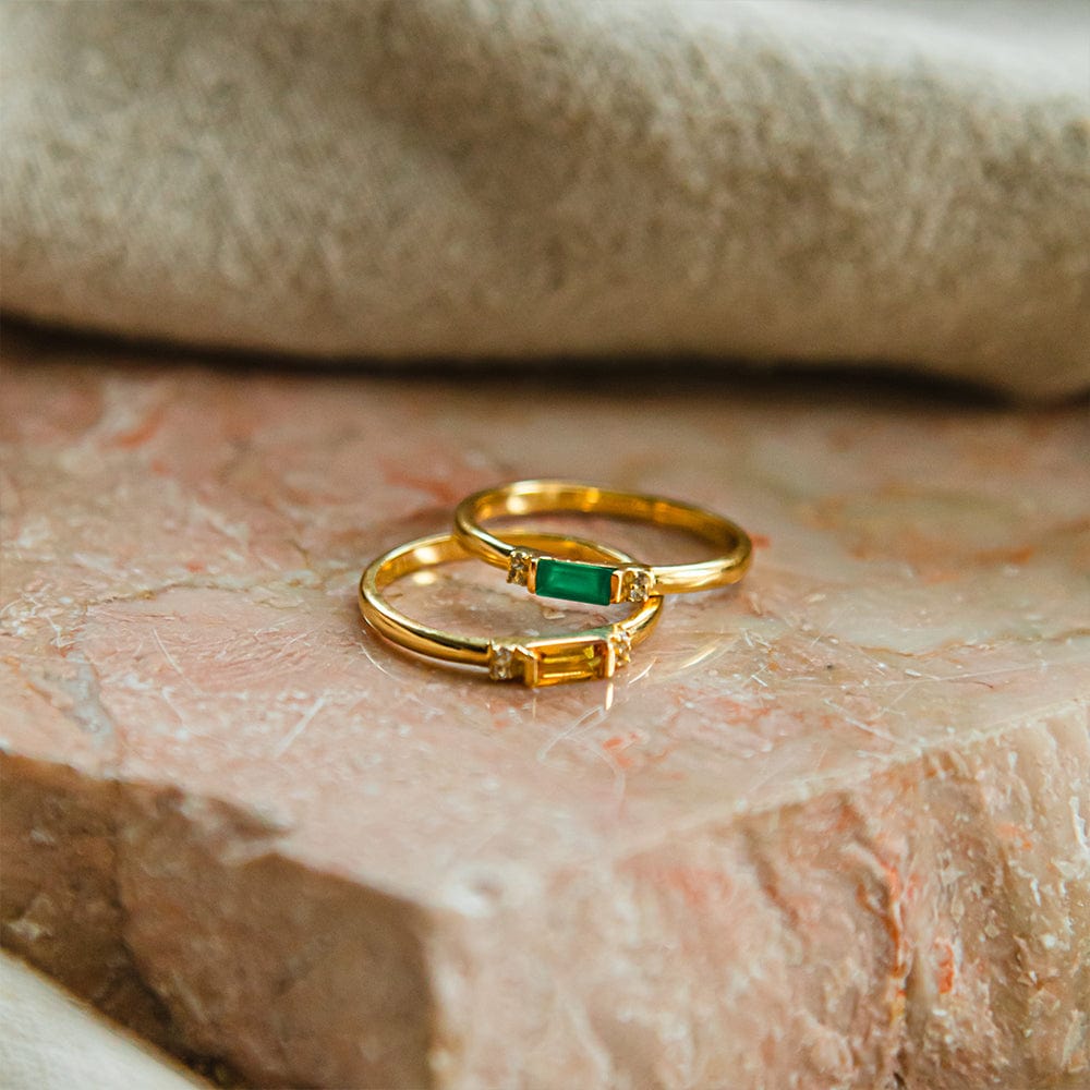 Featuring Citrine and Green Onyx set in 18ct gold plate, this layering set represents self-expression, strength and confidence. The perfect gift for someone in need of a little boost.