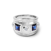 A real treasure brought to life. This sterling silver plated brass ring features blue and white gemstones on a brushed think band. The only statement ring you'll need for this season.