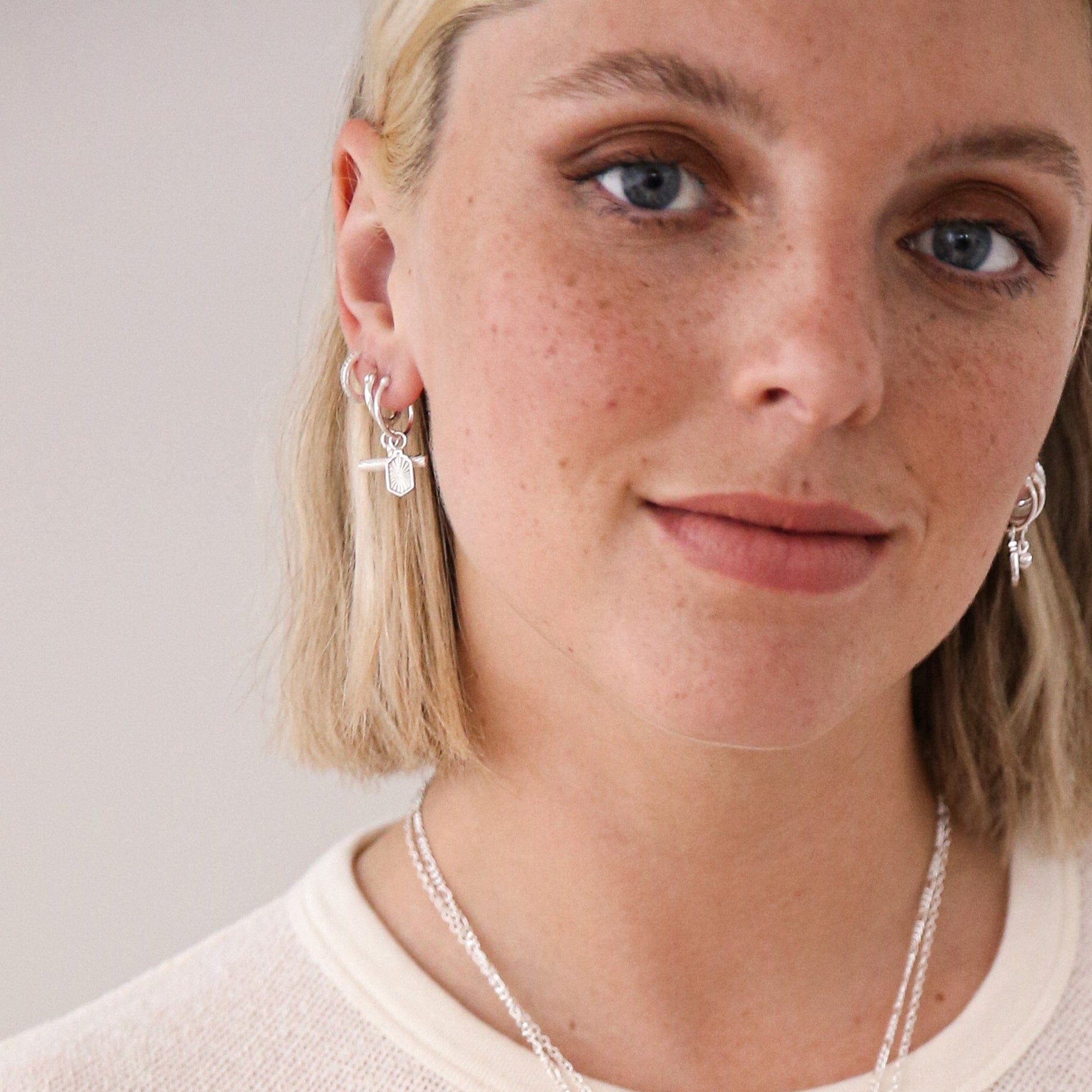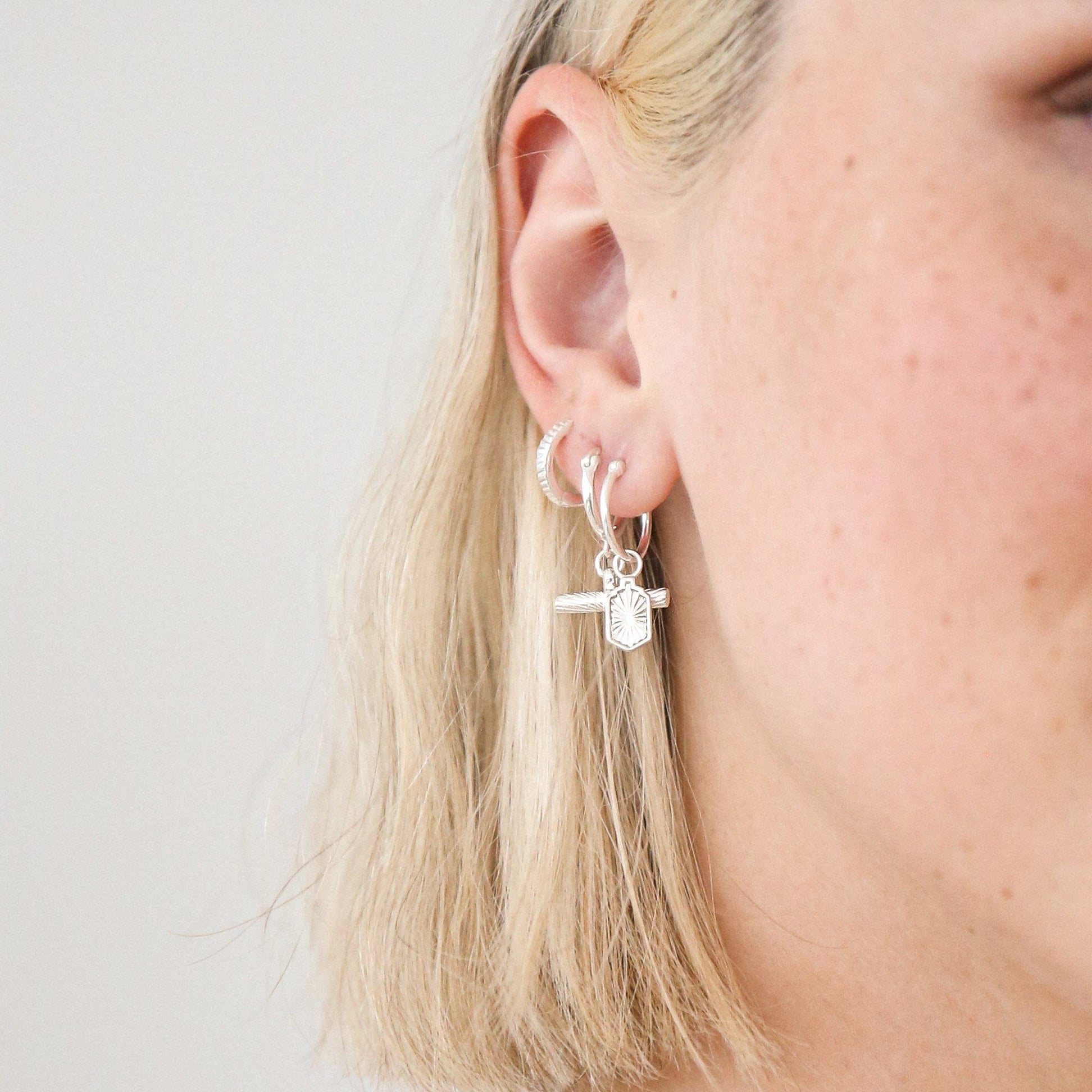 Up your ear game and ward off those negative vibes with our Estée Lalonde Sunburst Shield Mini Charm Earrings handcrafted in 100% recycled sterling silver. Wear solo for a simple stack or layer up with other hoops for a statement stack.