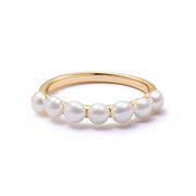 The perfect pearl piece to have in your ring rotation. Made from 100% recycled sterling silver with 18ct gold plate with seven freshwater pearls set in the band. Wear solo or stack with the Mini Pearl Ring for an statement look.