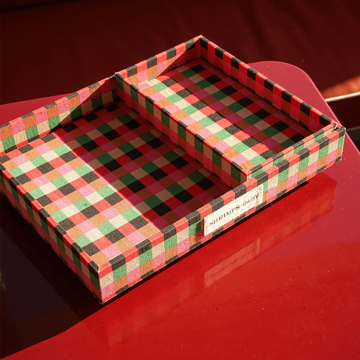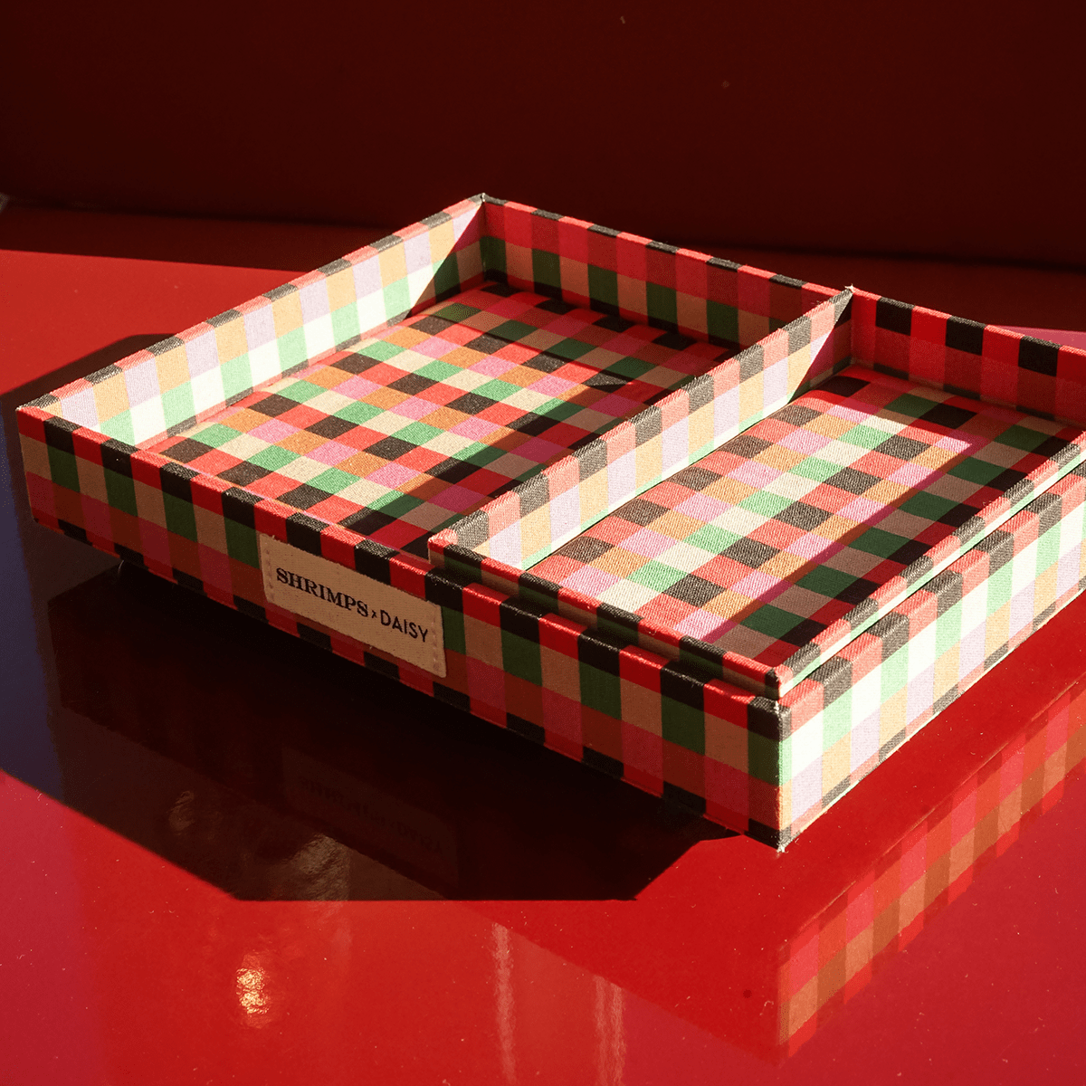 Made with Shrimps very own multi-colour grid base print, featuring a removable inner tray, a cushioned base and wooden rounded feet, the Shrimps x Daisy Trinket Tray is guaranteed to brighten any space.