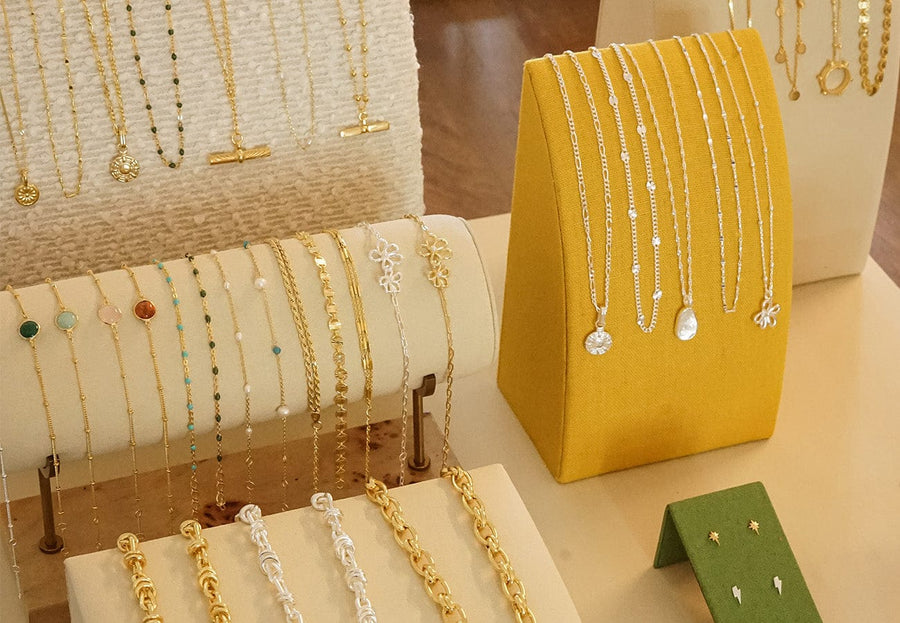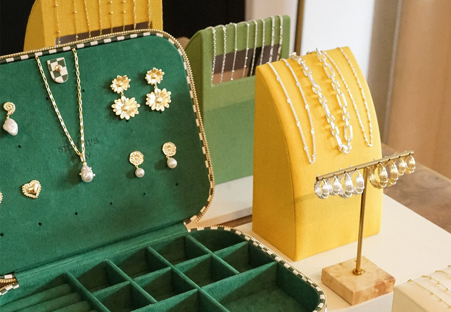 Our brand new display has been developed to add some well deserved colour and life to your Daisy display. With a variety of materials used, such as faux suede, cotton linen blend and burl wood laminate, this display has been designed to add depth, texture and a chic playfulness that matches the Daisy brand. Each component has been thoughtfully created to display the jewellery in a space efficient way, fusing style and functionality.
