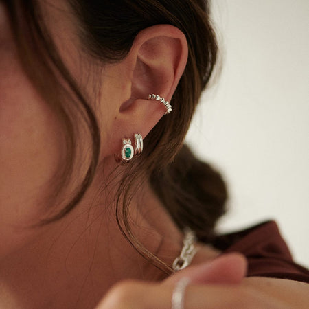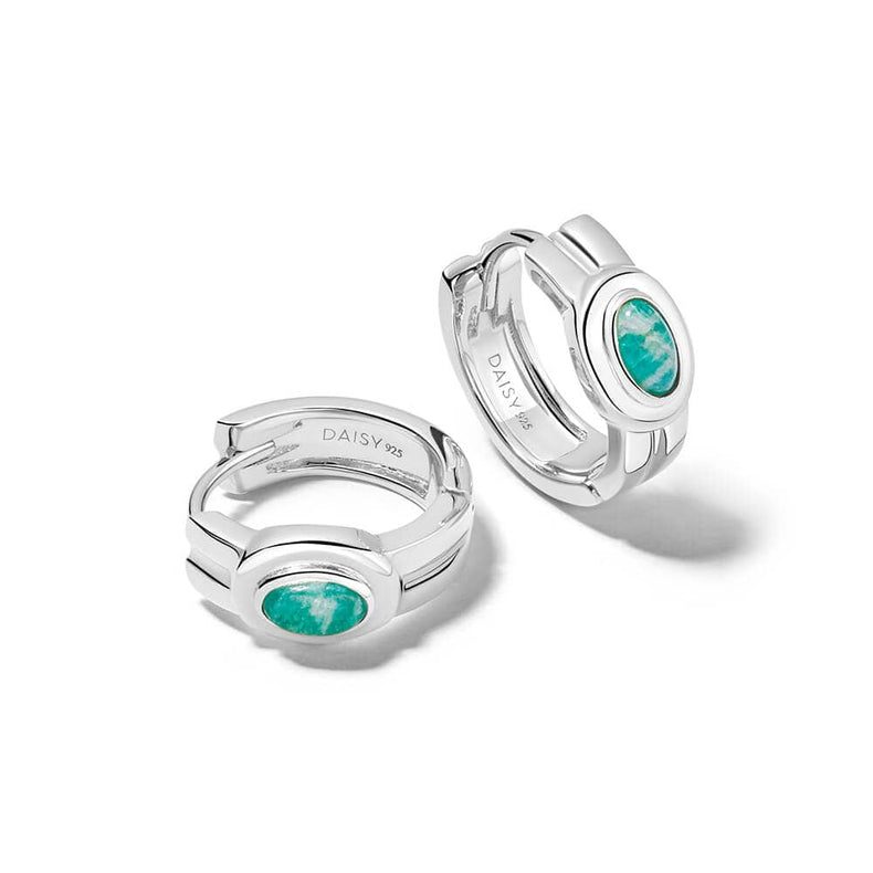 Feel calm. Look good. This serene semi-precious stone is set on a beautiful sterling silver huggie hoop charm. One of nature’s most ancient stones, the turquoise hue of Amazonite is said to soothe the senses and calm the soul, bringing balance and peace to the wearer.