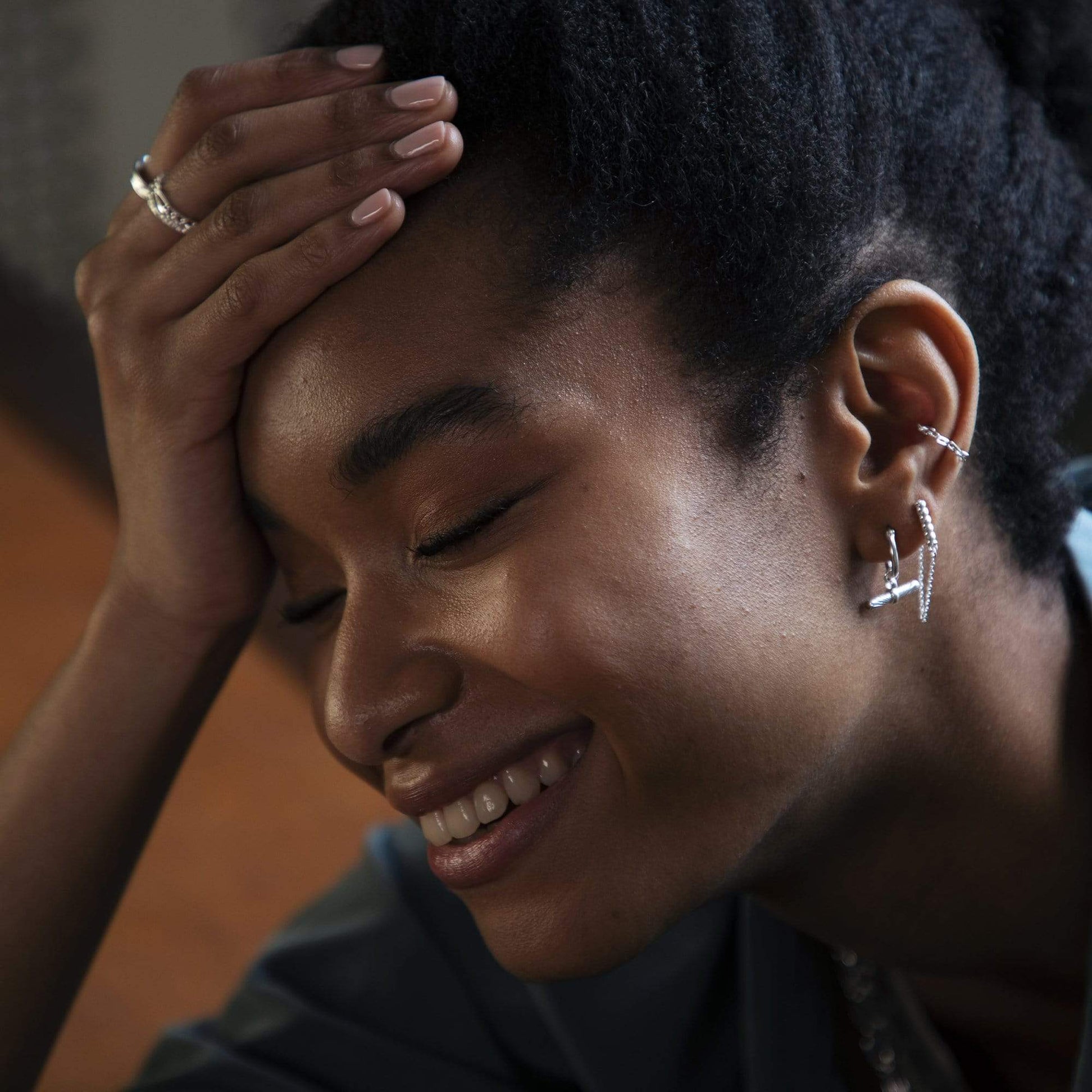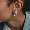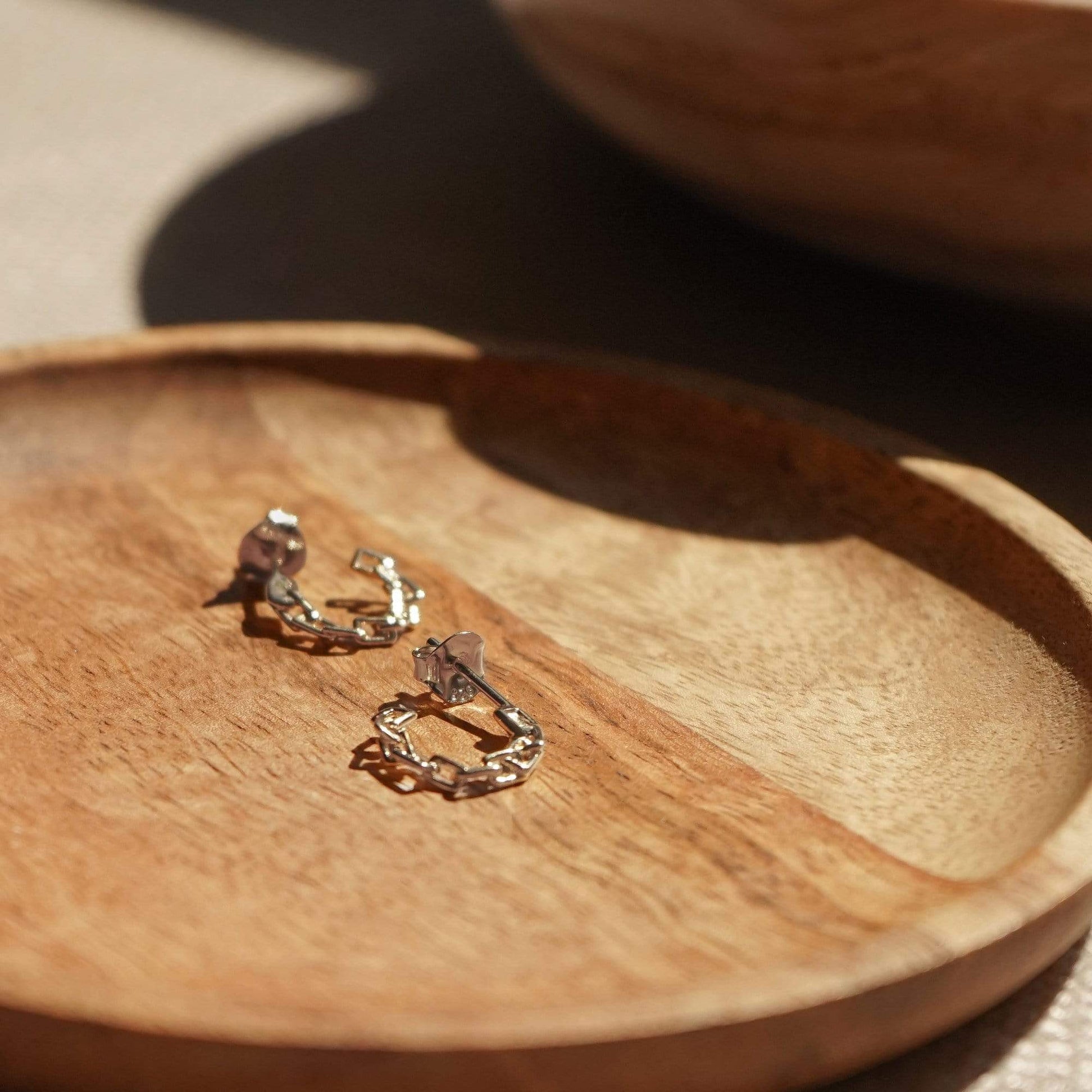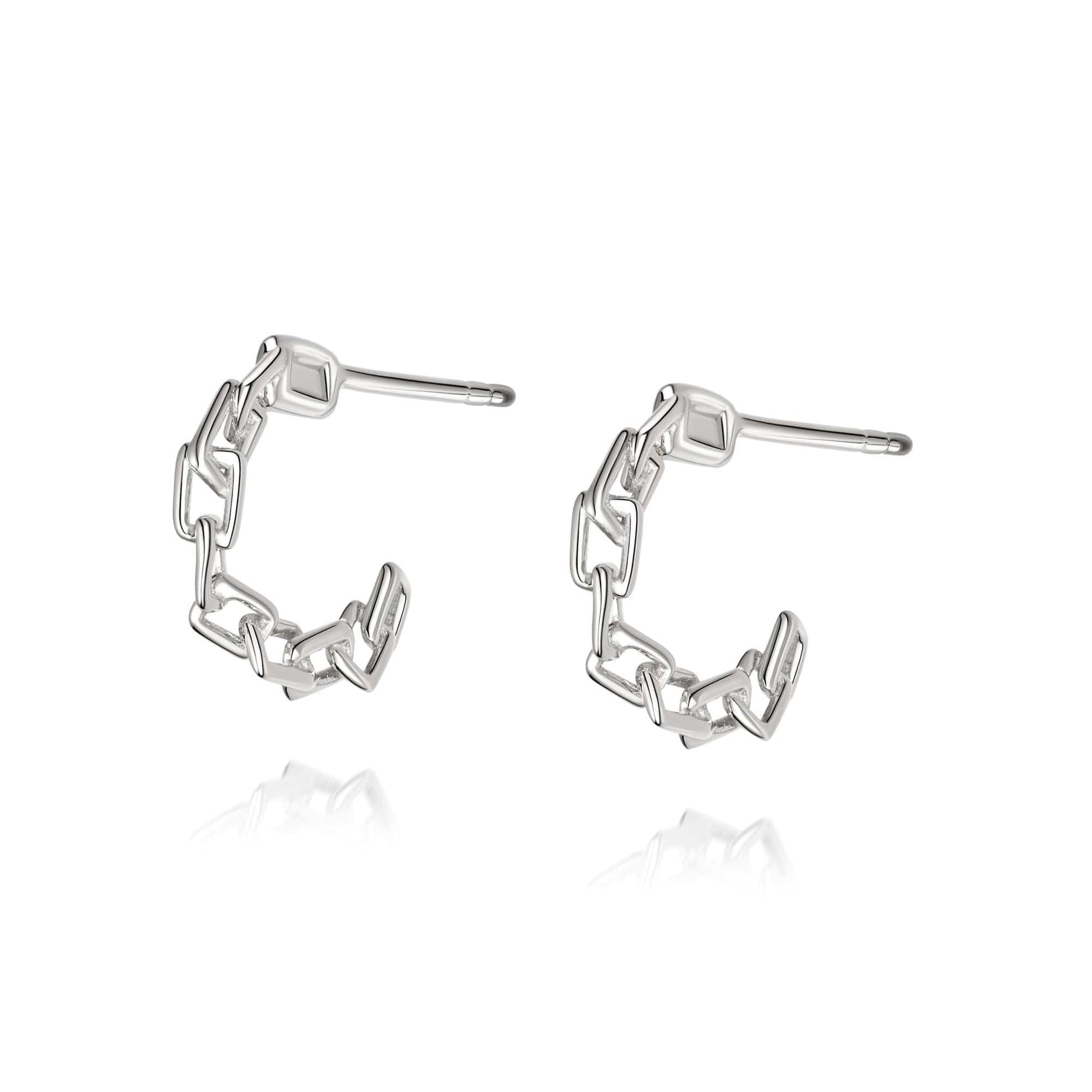 A finer style with space between the lobe and earring, the Chain Mini Huggie Hoop Earring is perfect for giving your stack a fresh shape and texture. Crafted in 100% recycled sterling silver the chain links are structured, ideal for upper lobe piercings and paired with drop styles for a unique look.