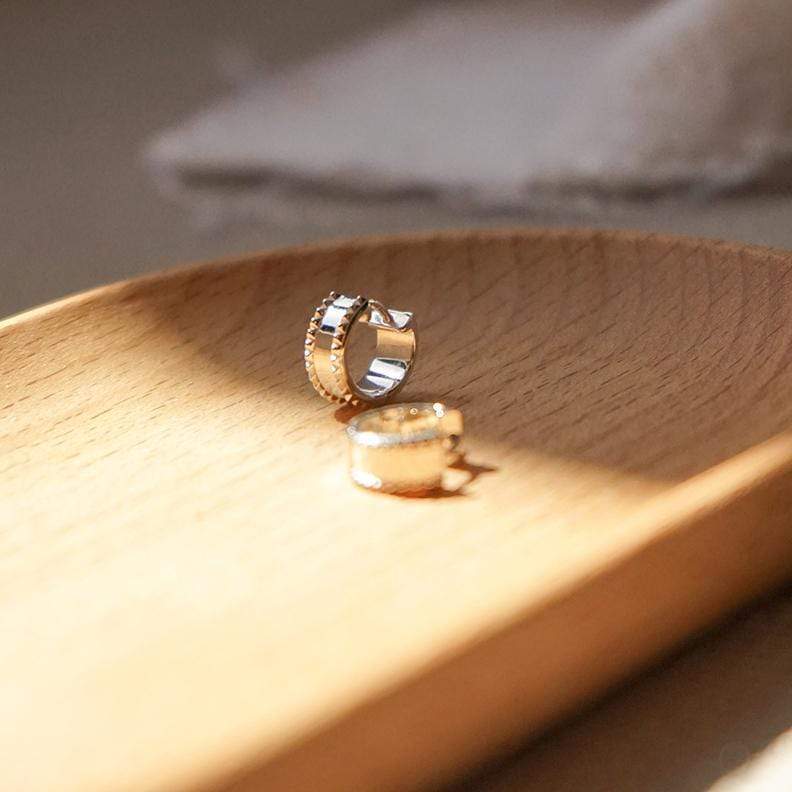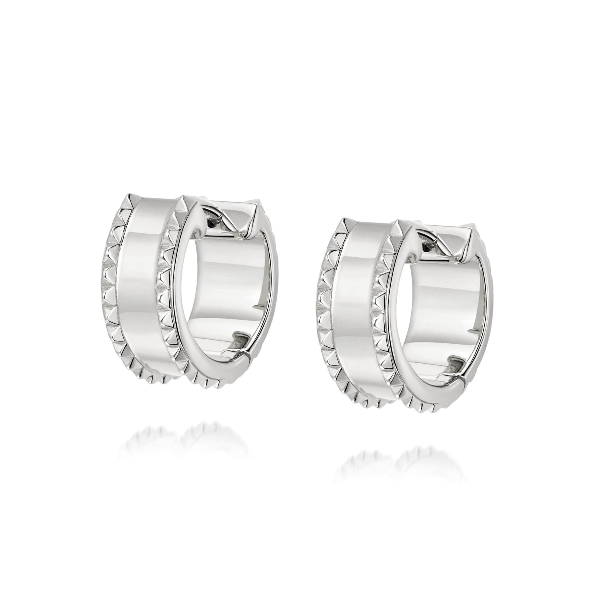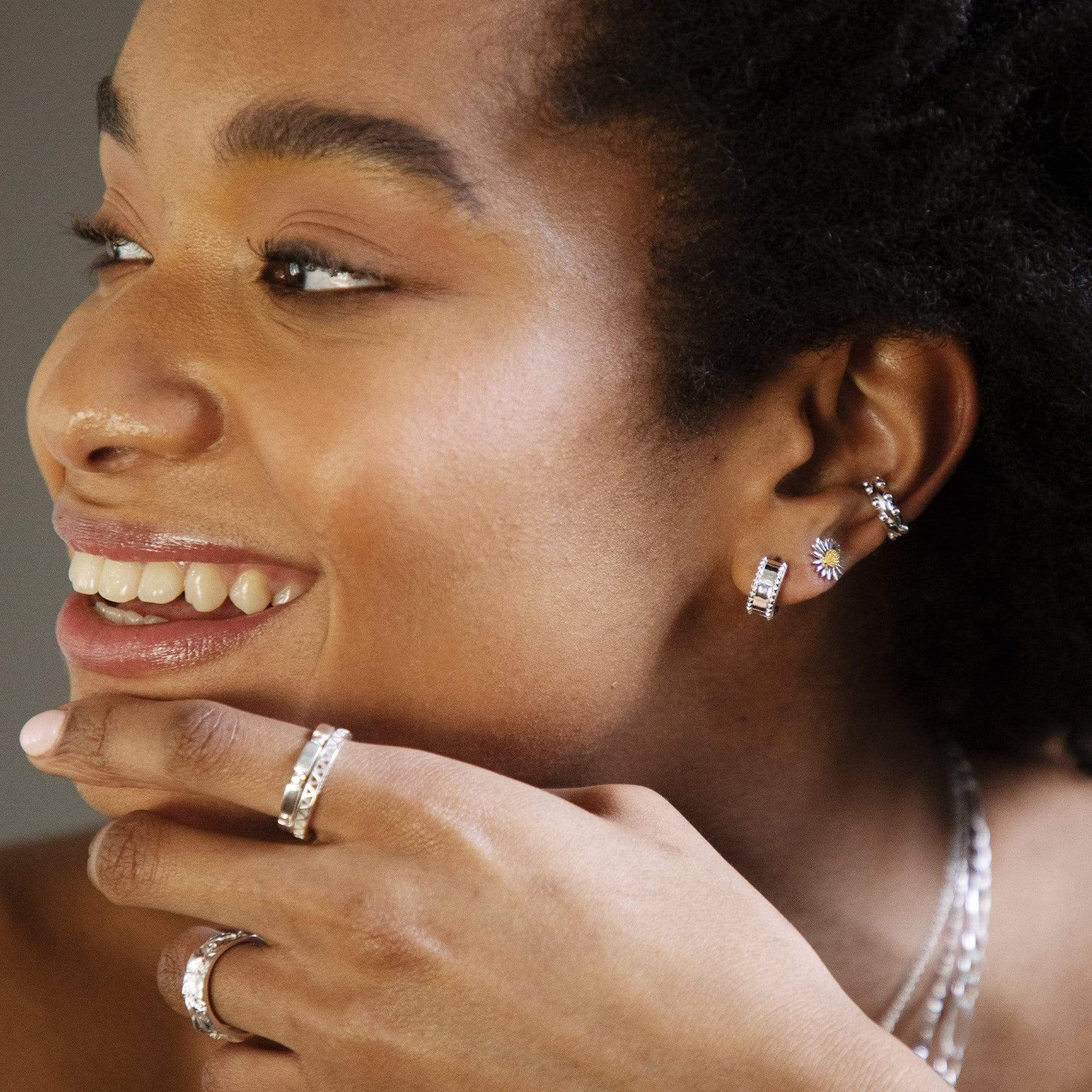 What can we say, your everyday statement piece has arrived. Hand-crafted in 100% recycled sterling silver featuring a trim of textured detailing the Chunky Studded Huggie Hoop Earrings tightly hug the ear, the perfect piece for upper lobe piercings to create a stack with a serious edge!