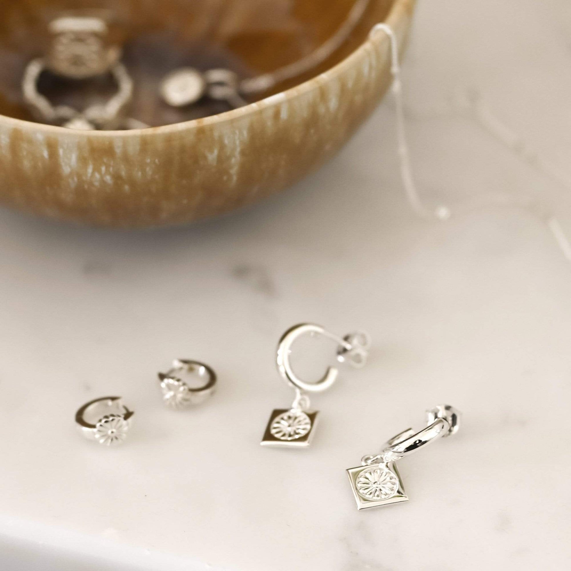 Hand-crafted in 100% recycled sterling silver, featuring an engraved wild daisy symbol, the Daisy Bloom Drop Earrings can be worn alone for a laidback daytime look or paired with your favourite hoops and huggies for a statement stack.