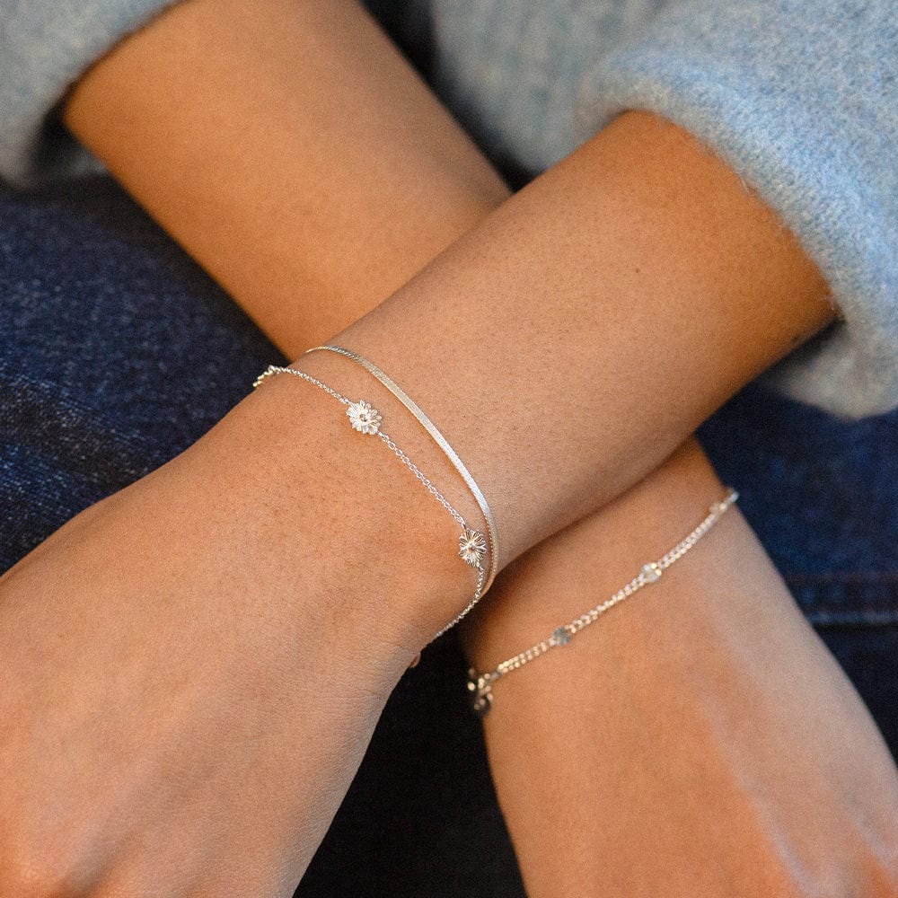 A daisy chain that lasts a lifetime. This bohemia inspire stack is carefully crafted in 100% recycled sterling silver and features a delicate chain of daisy and our bestselling fine snake chain bracelet. For those hazy summer days and beyond.