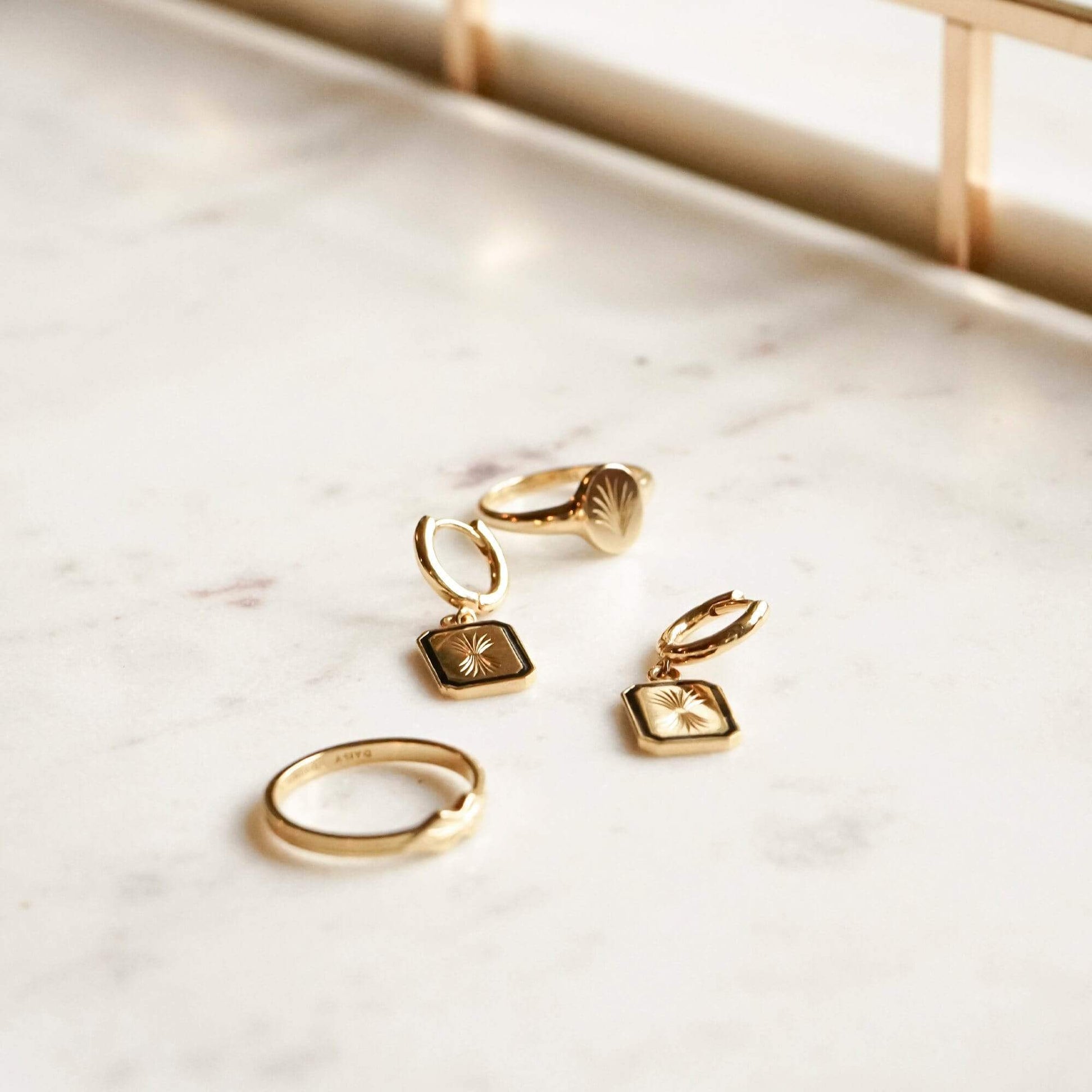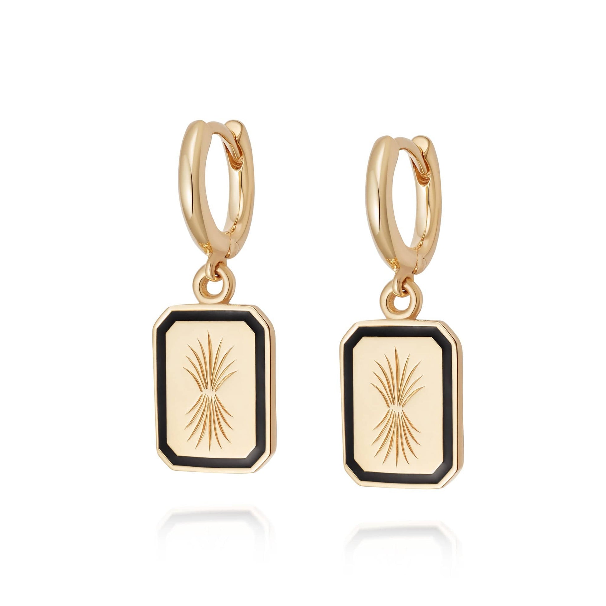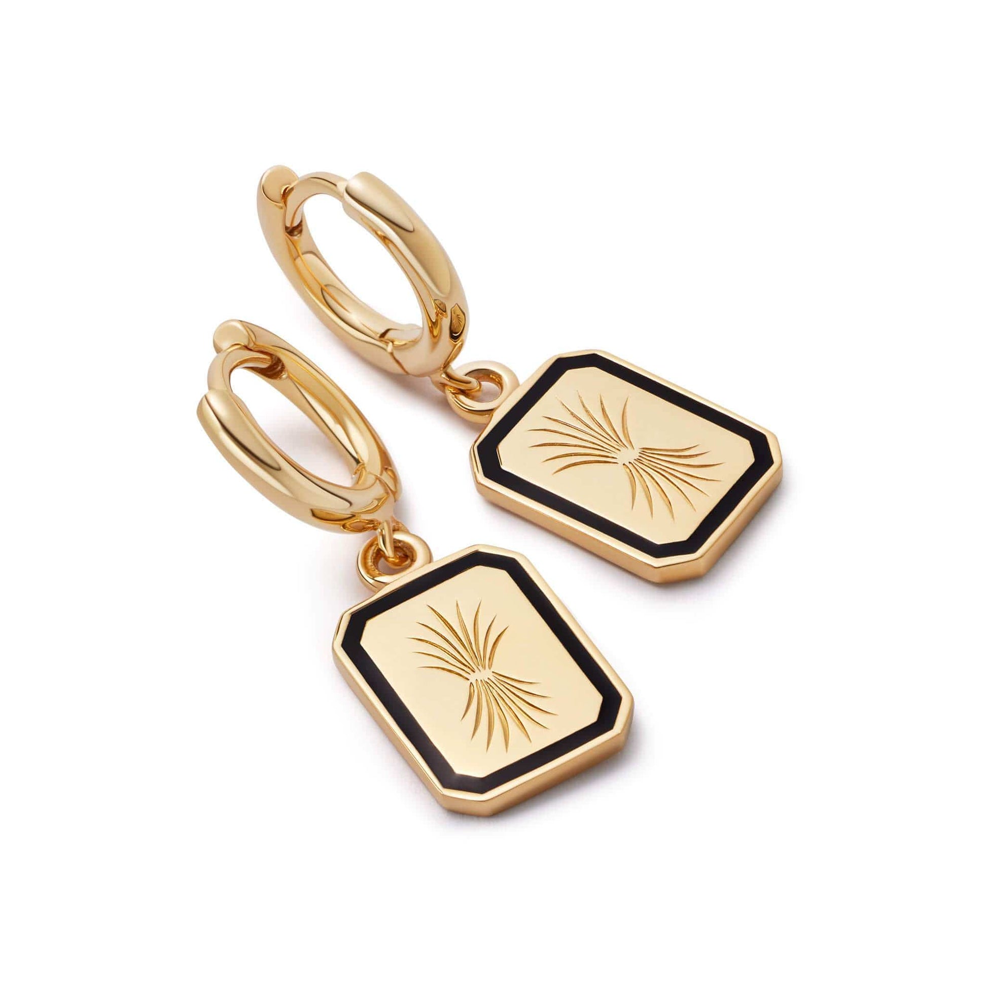 Featuring a palm design inspired by a family heirloom, the Engraved Enamel Drop Earrings are crafted in 18ct gold plate with a black enamel border. These statement makers look best in the first piercing styled alongside a simple gold hoop.