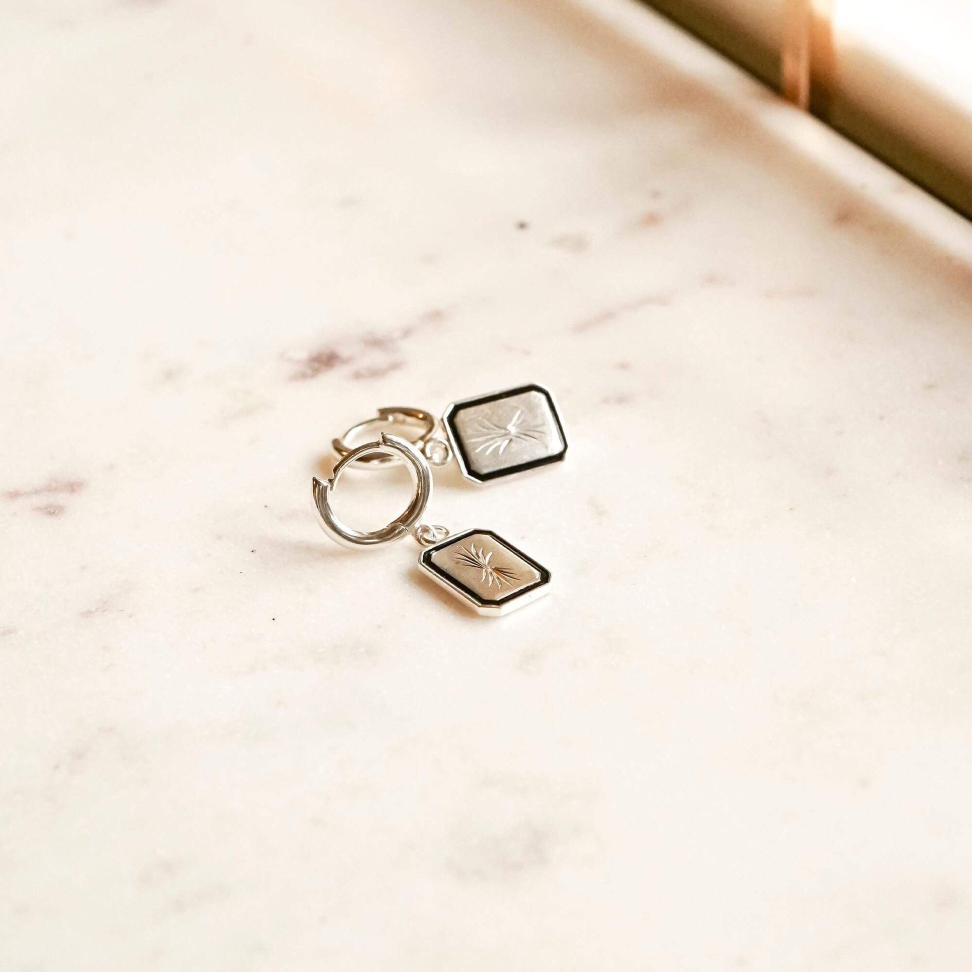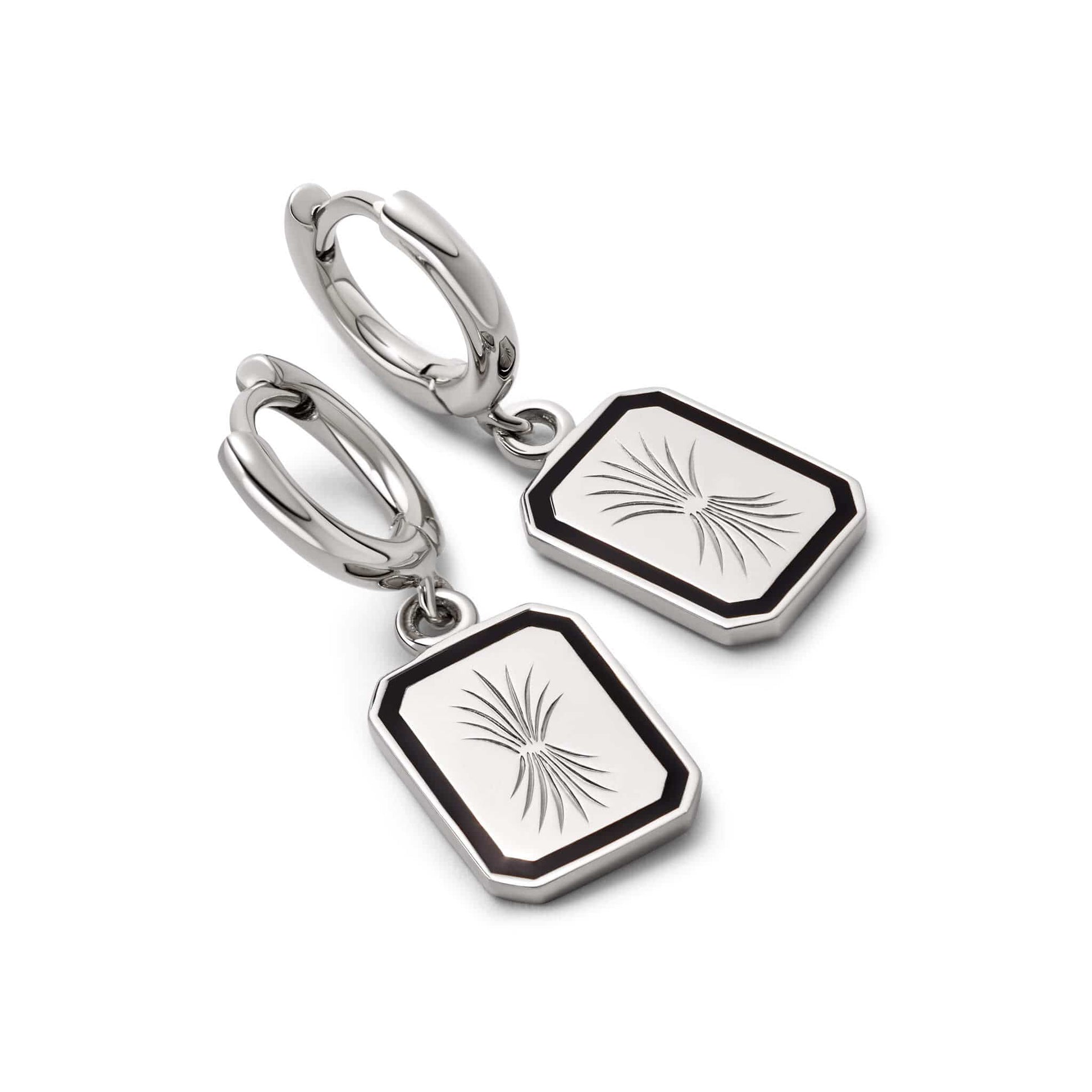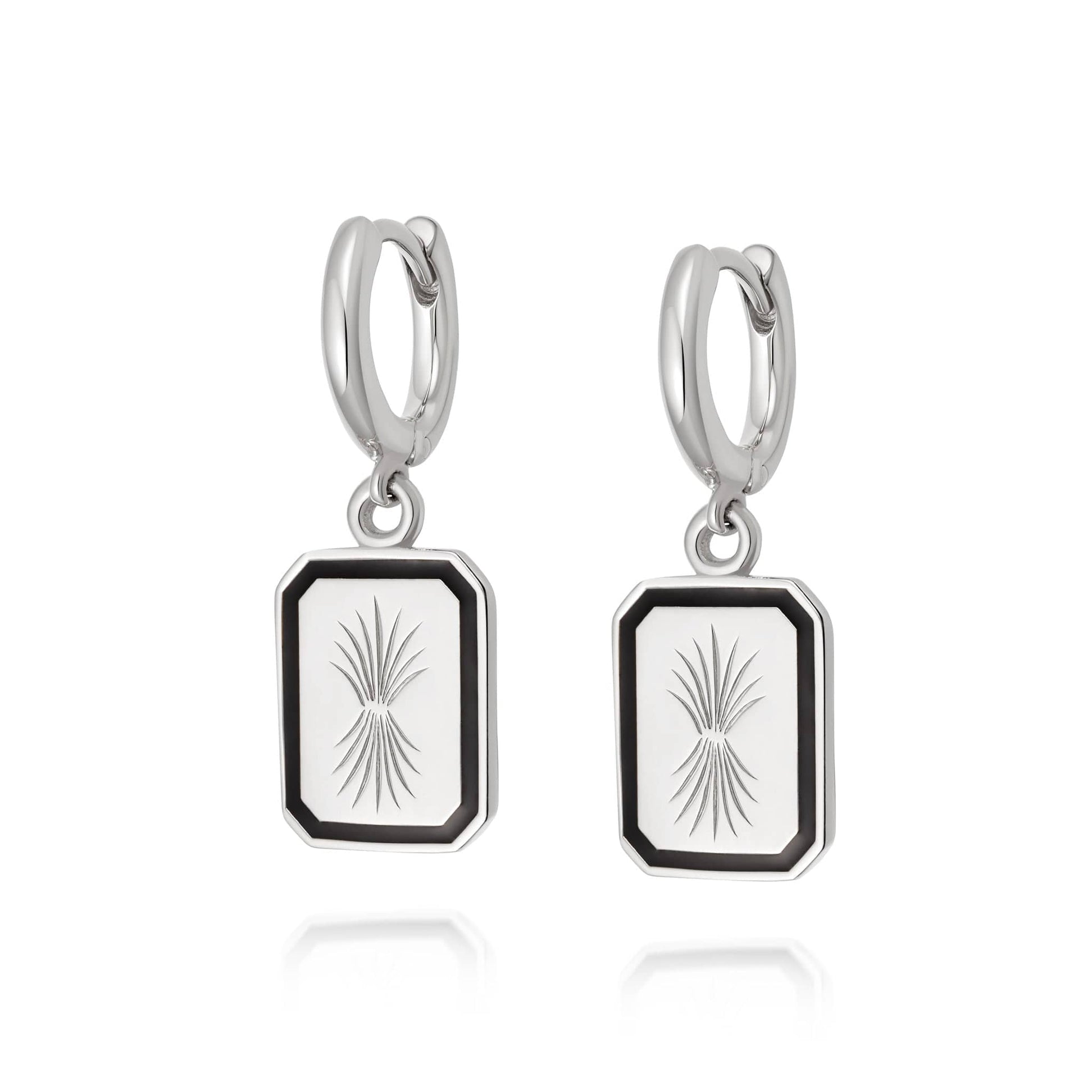 Featuring a palm design inspired by a family heirloom, the Engraved Enamel Drop Earrings are crafted in 100% recycled sterling silver with a black enamel border. These statement makers look best in the first piercing styled alongside a simple gold hoop.