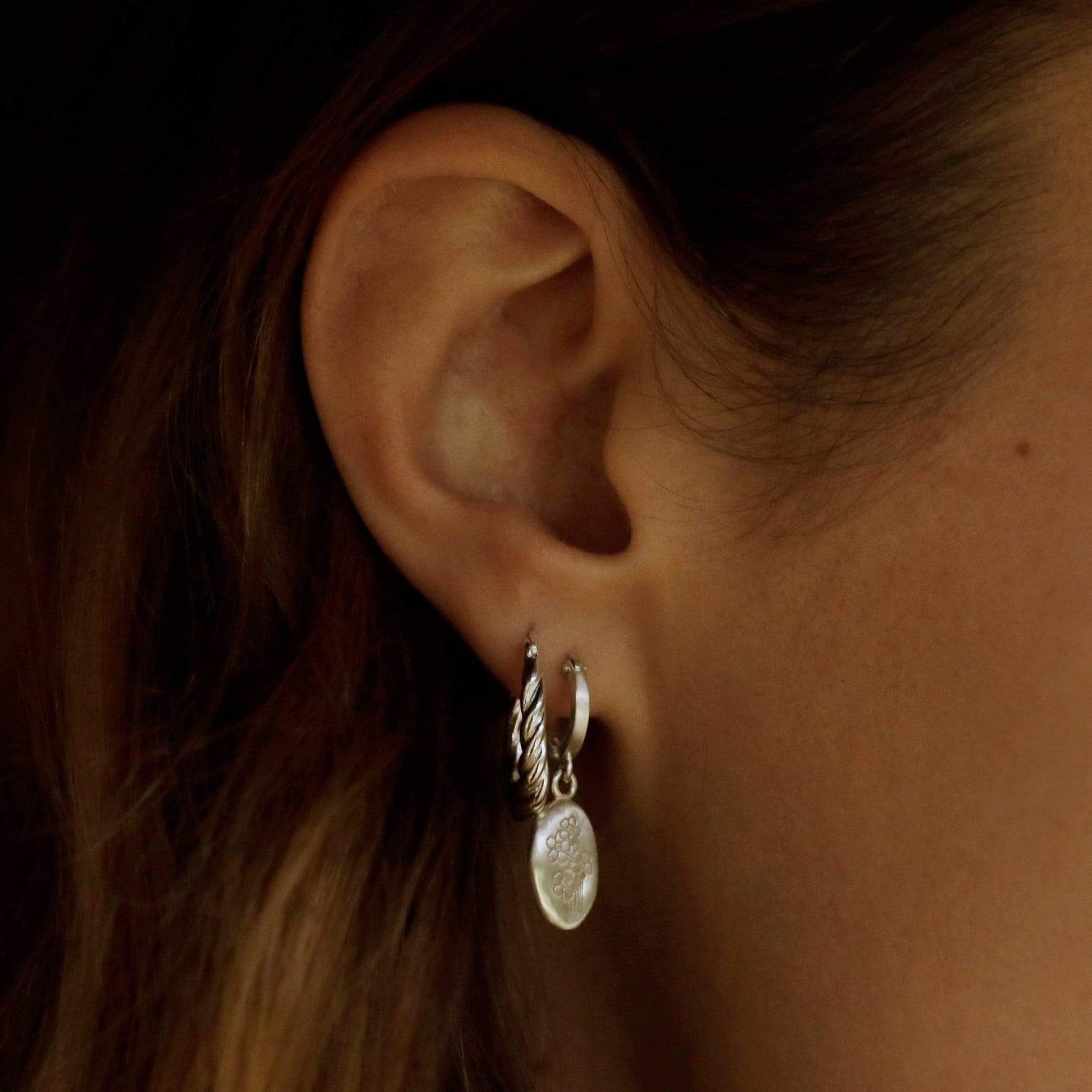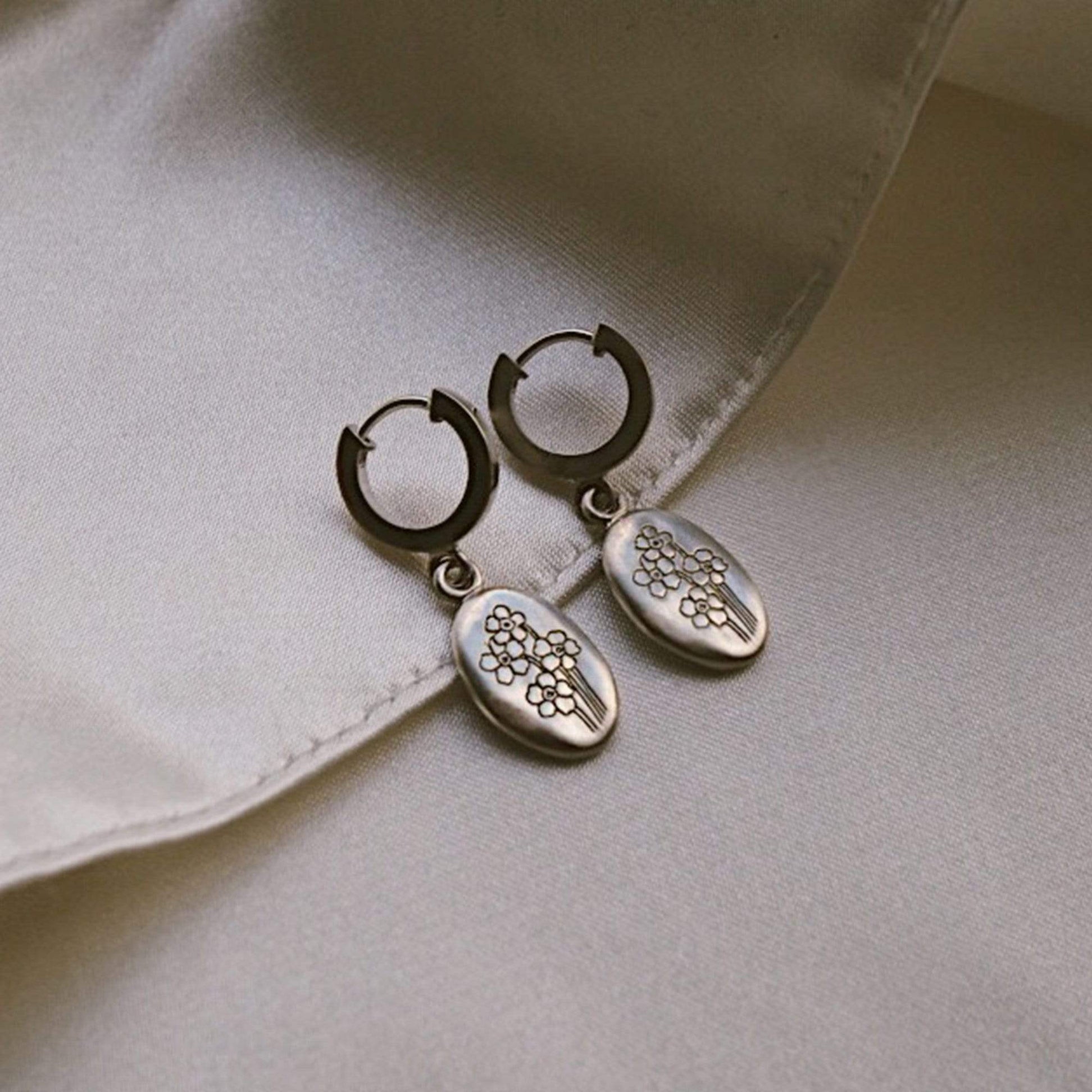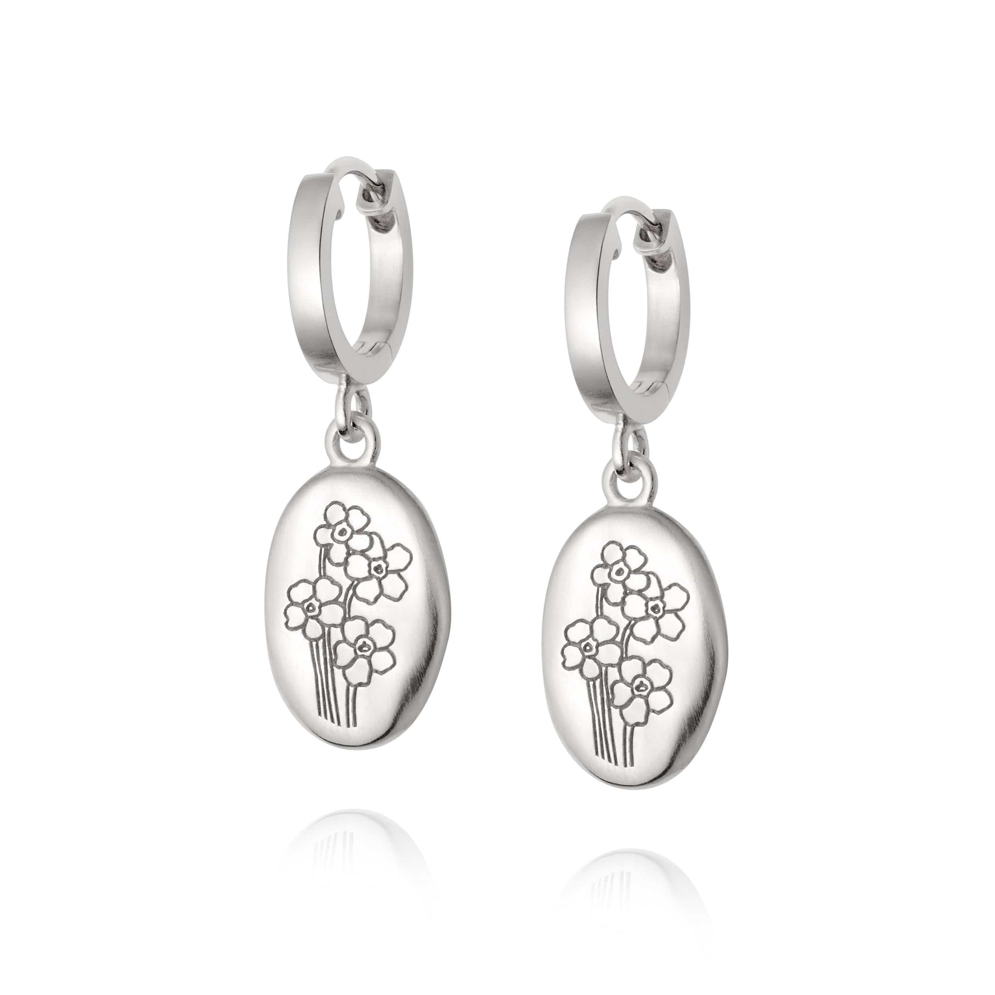 A symbol of memories, these earrings are a forever keepsake. Made from 100% recycled sterling silver with a subtle matte finish, the Forget Me Not Drop Earrings feature an oval pendant with a set of etched flowers. Our unique take on a traditional wax seal, hung from chunky huggie hoop.