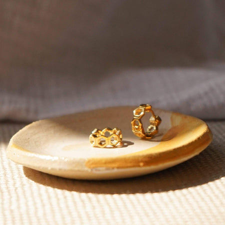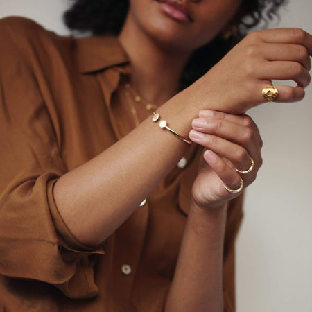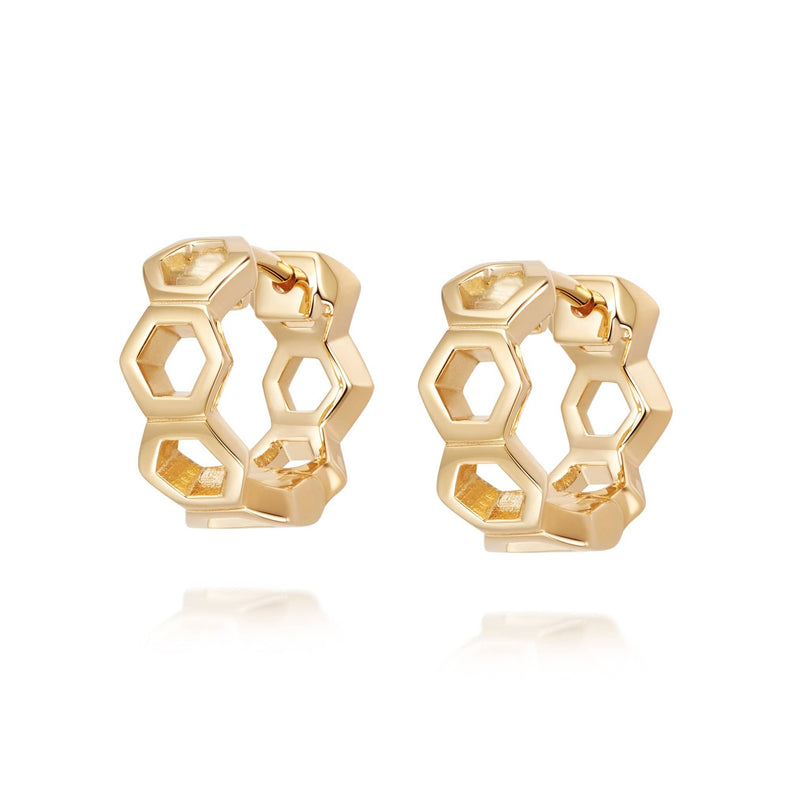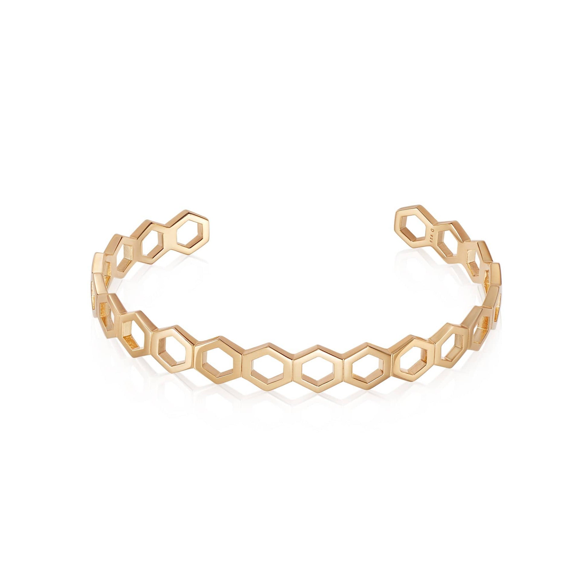 Easy to slip on with maximum impact the Hexagon Palm Cuff bangle. Crafted in 18ct gold plate featuring an unmissable hexagon pattern repeated. Go for a bold look and double up or wear solo for a simple statement.