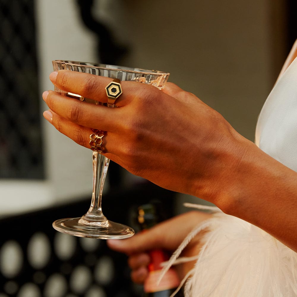 Wield that 'kiss the ring' energy with the Hexagon Palm Ring Layering Set. Including the statement Hexagon Palm Signet Ring, complete with intricate black enamel work, paired with the striking cut-out design of the Hexagon Palm Band Ring. Both handcrafted in 18ct gold plate on 100% recycled sterling silver, this is a dangerously dynamic duo. Think you can handle it?