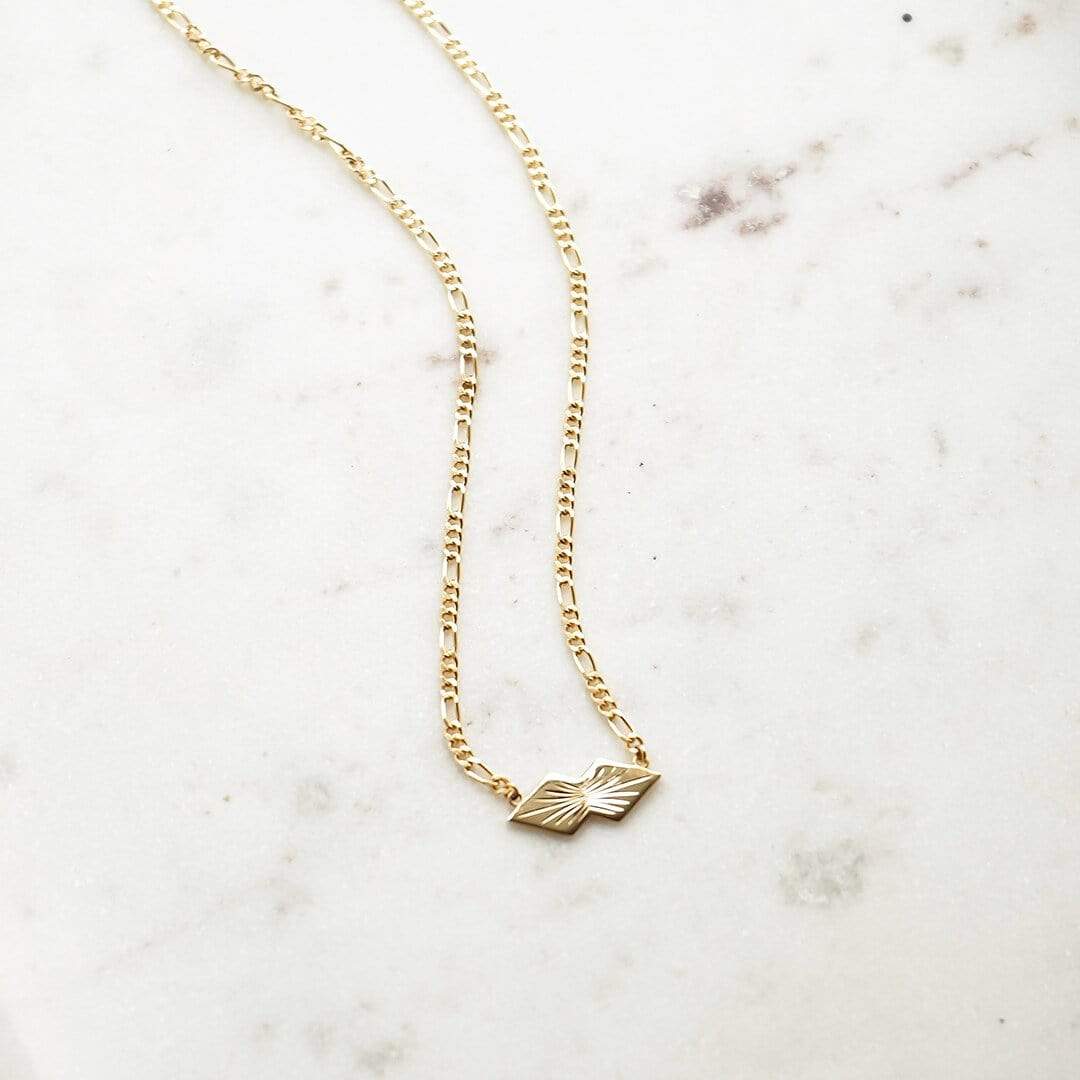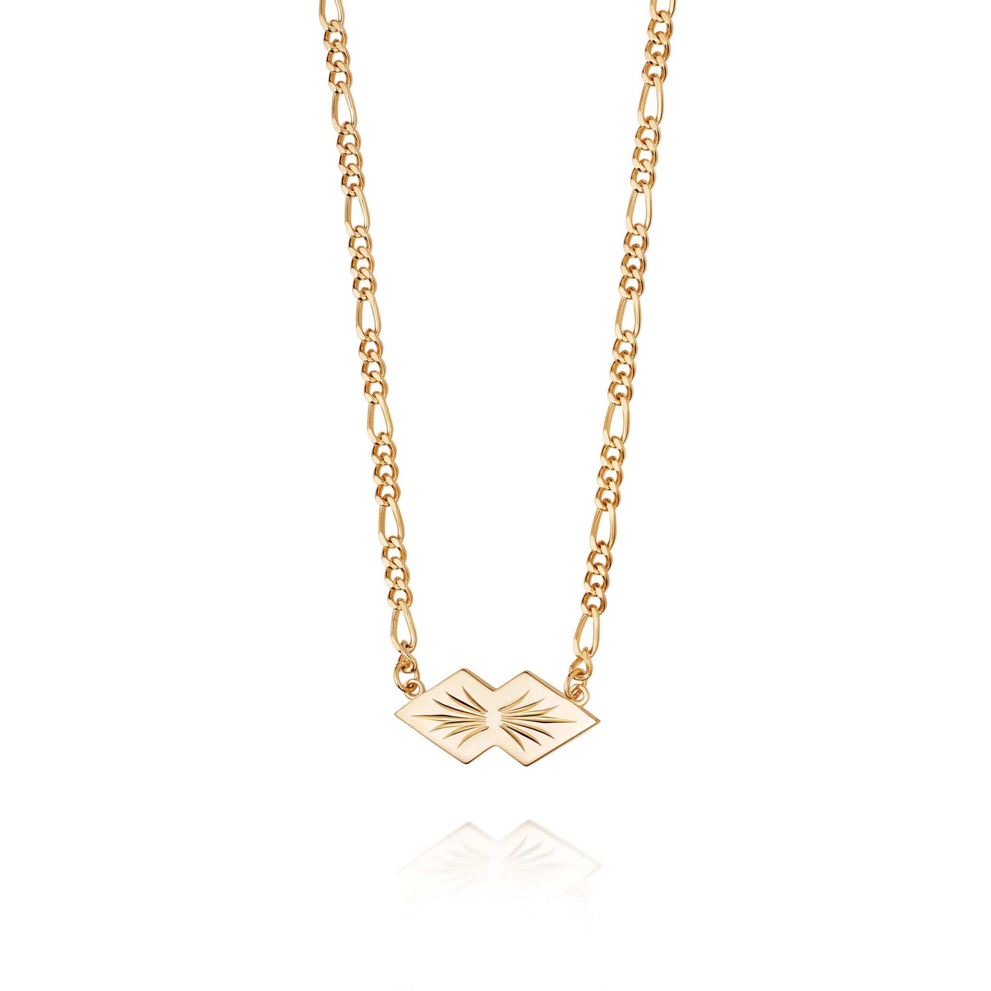 Inspired by a family heirloom, the Mini Engraved Leaf Necklace features an eye-catching symmetrical palm leaf engraving. Hand-crafted in 18ct gold plate, this necklace can be worn as a solo statement piece, or as the perfect compliment to your necklace stack.