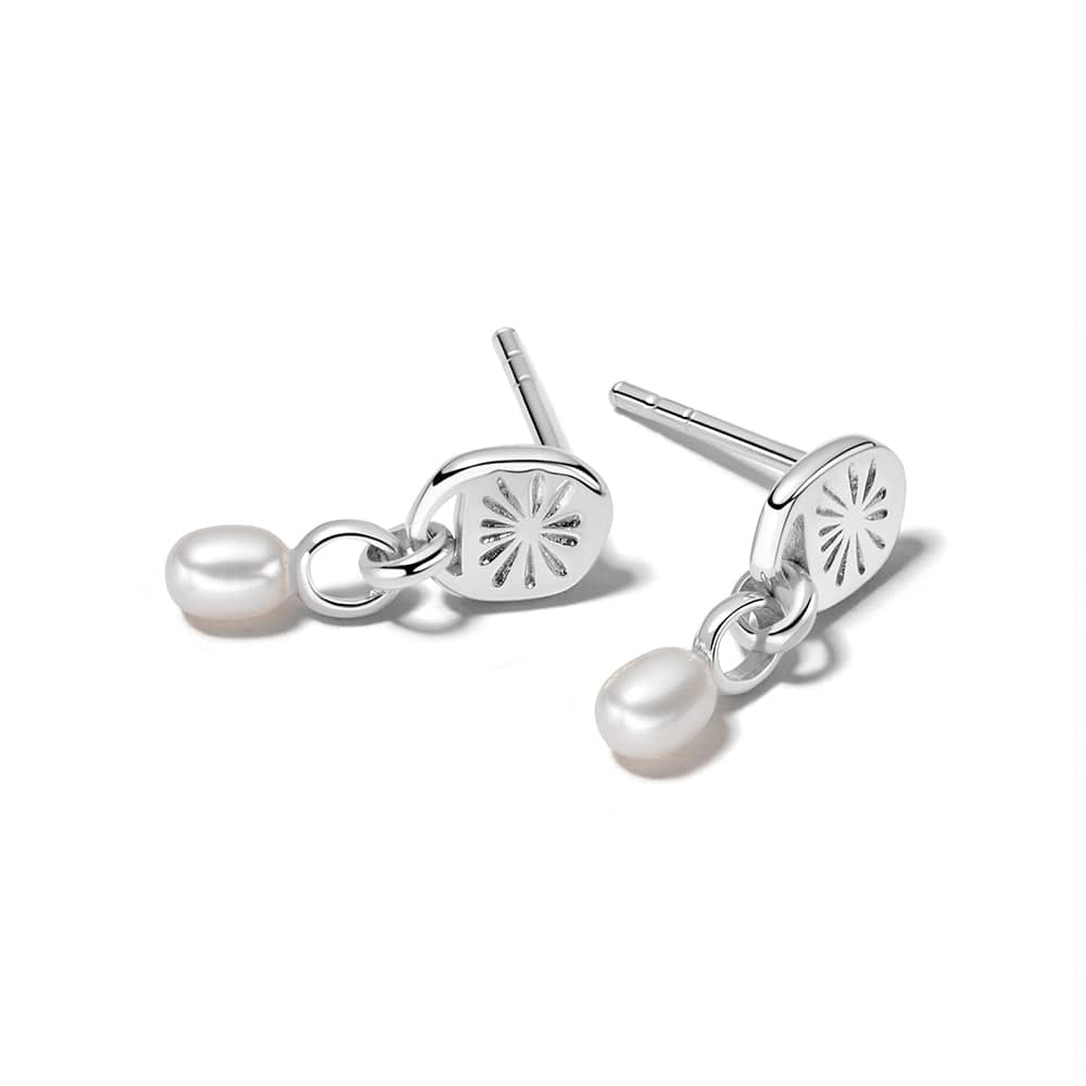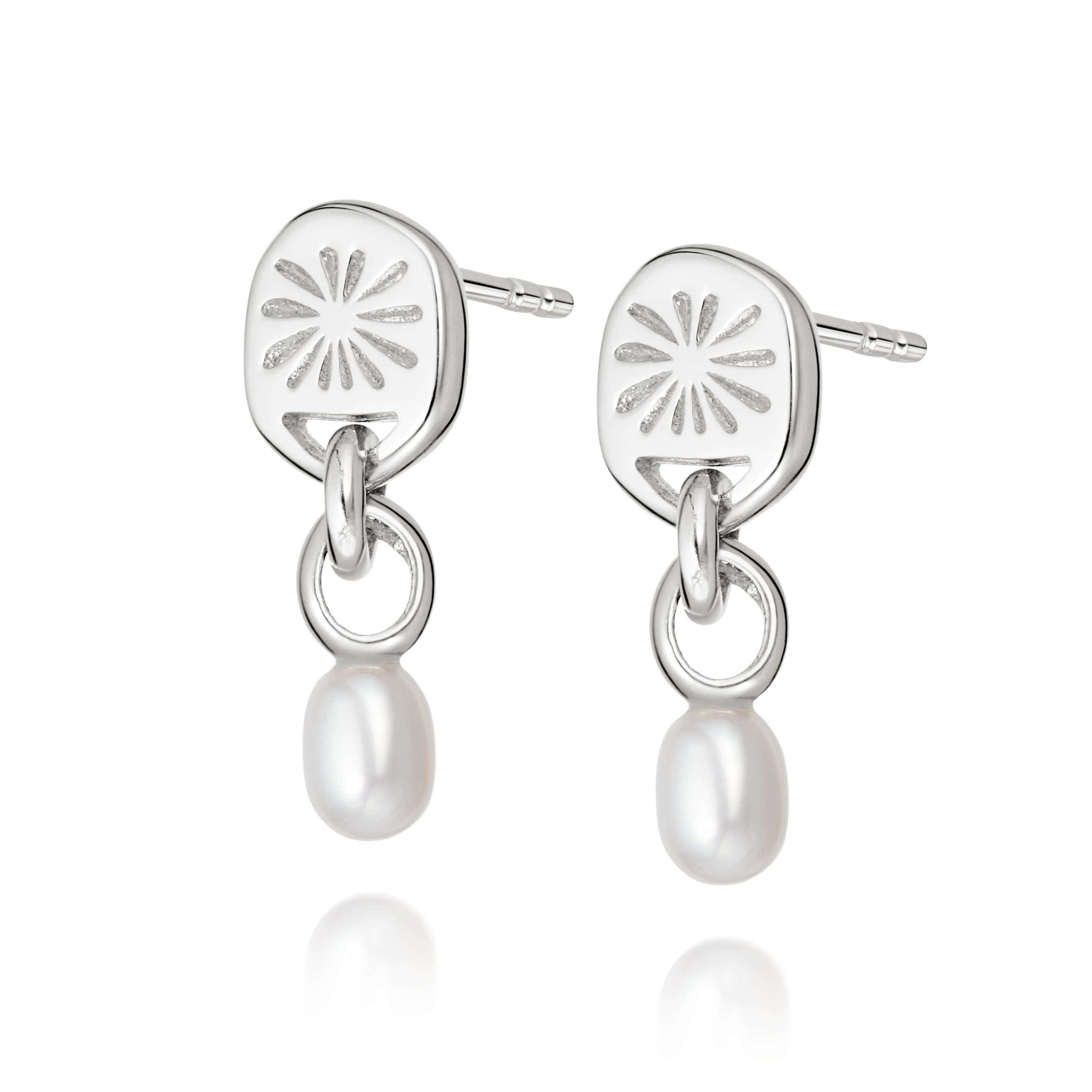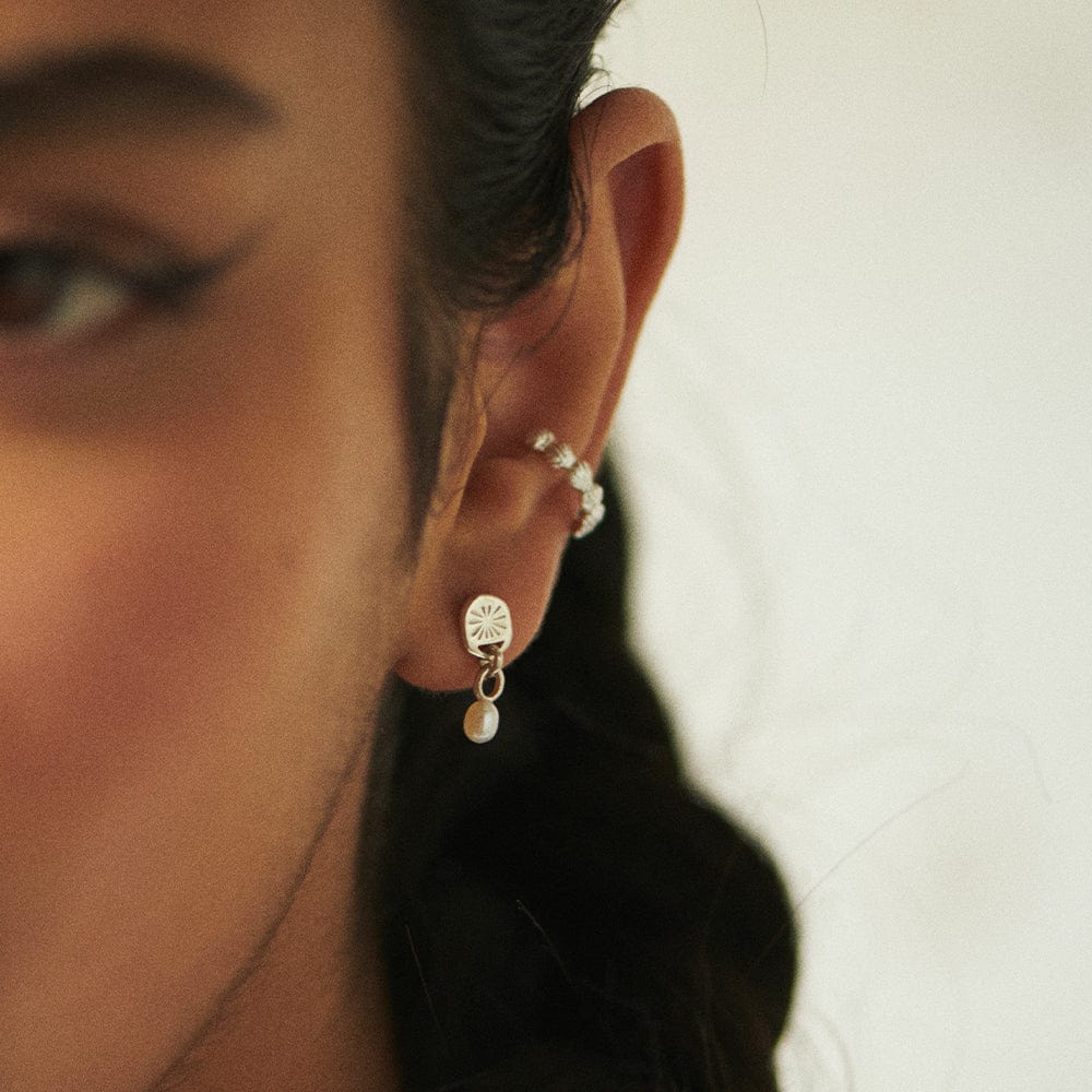 Add something unexpected to your stud collection. Made in 100% recycled sterling silver with an engraved sunburst pattern and delicate seed pearl drop. Perfect for any ear piercing and looking as good solo as stacked, you won't be able to take these little treasures off.