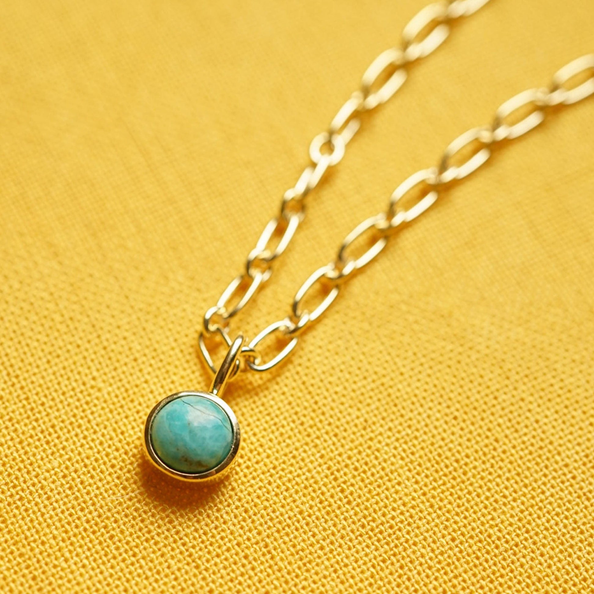 This bright turquoise stone is said to focus it's energy on self love and acceptance. Hung on chunky chain made from 100% recycled sterling silver, this gemstone necklace is perfect piece to give yourself or a loved one for any occasion.