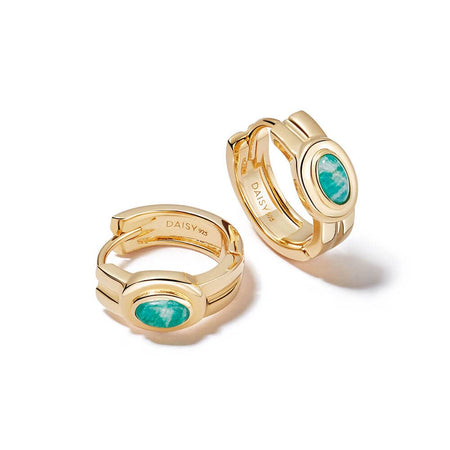 Feel calm. Look good. This serene semi-precious stone is set on a beautiful gold plated silver huggie hoop charm. One of nature’s most ancient stones, the turquoise hue of Amazonite is said to soothe the senses and calm the soul, bringing balance and peace to the wearer.