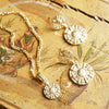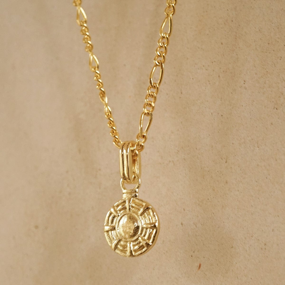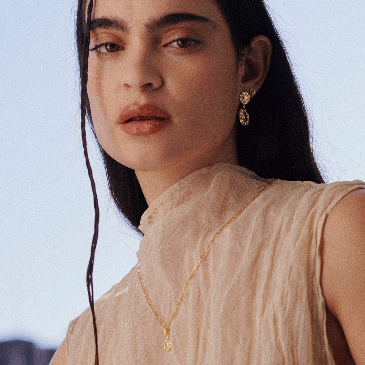 A fusion of warmth, protection, and vintage charm. This matching set of Apollo Double Drop Earrings and the Apollo Pendant Necklace features golden discs with intricate solar detailing, which catch the light from every angle.