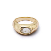 A solid, sculptural band in 18ct gold plate set with a standout white sapphire. Chunky, smooth with molten curves, a bold piece that grounds any ring stack or makes a confident solo statement.