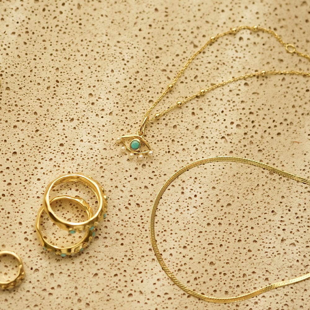 A symbol of protection and power to take with you wherever you go, this evil eye pendant is made from 100% recycled silver with 18ct gold plate. With a turquoise stone at the centre and seed pearls to finish on a bobble chain, this is the piece to add to your necklace stack.