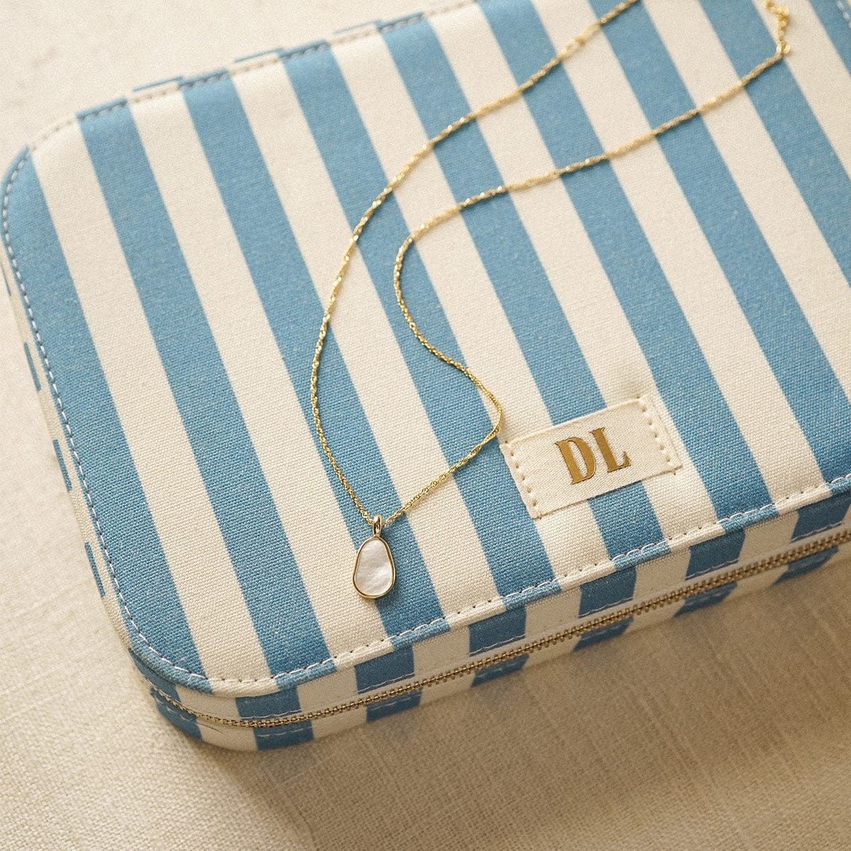 Stripes, shine, and something meaningful. Featuring our Blue Stripe Jewellery Case and Mother of Pearl Pendant Necklace, this set brings together style and storage in one thoughtful set. Your ready-made gift is here.
