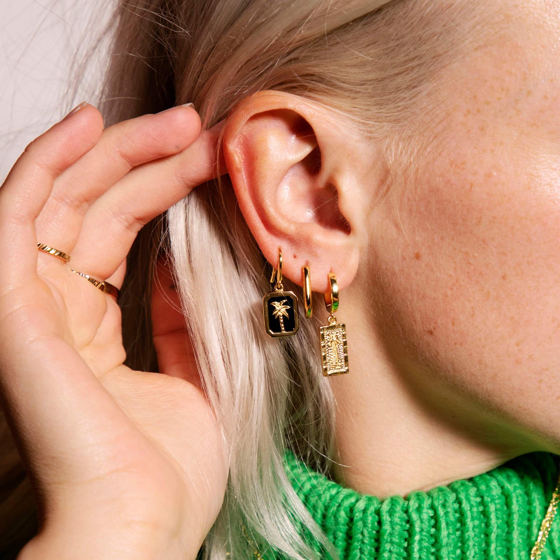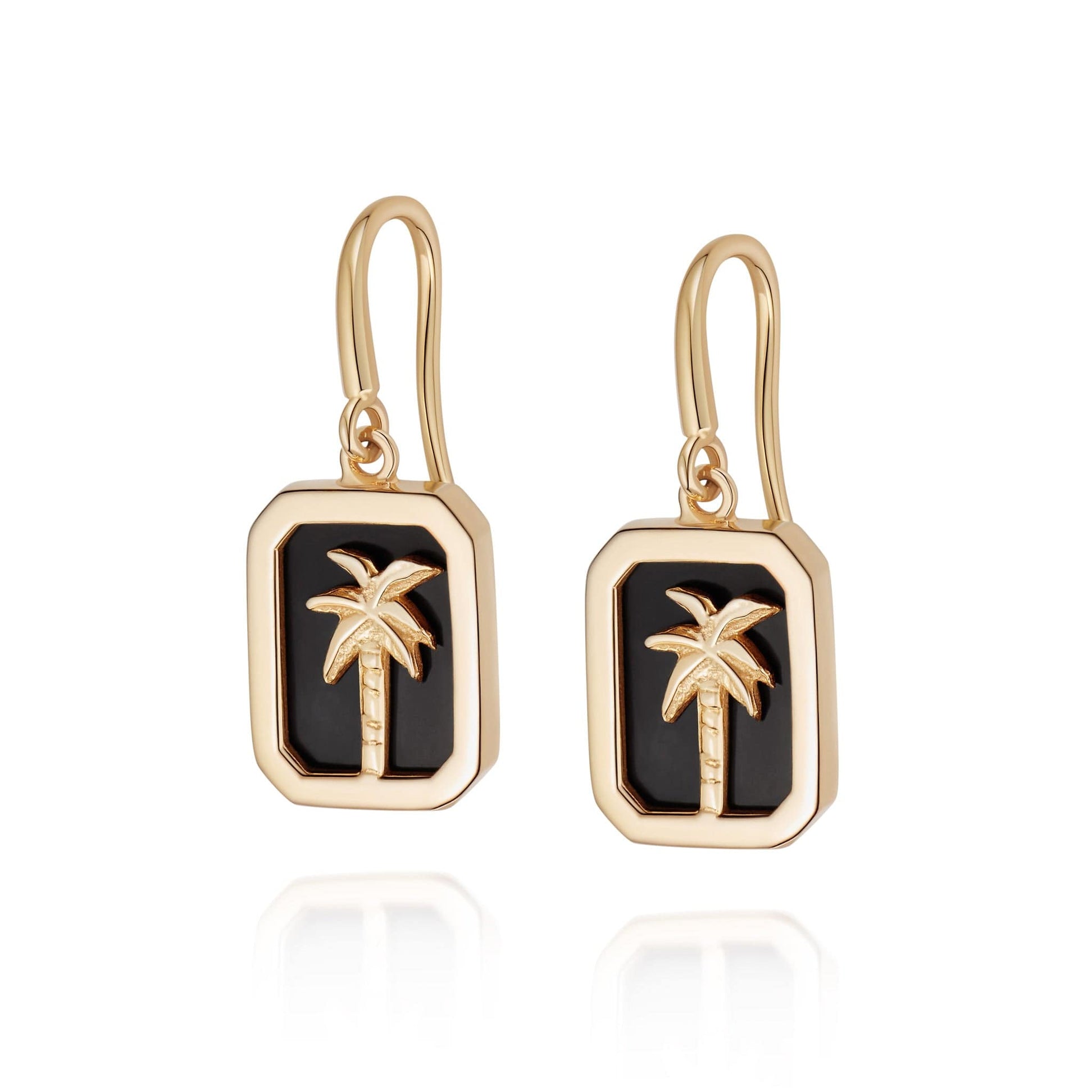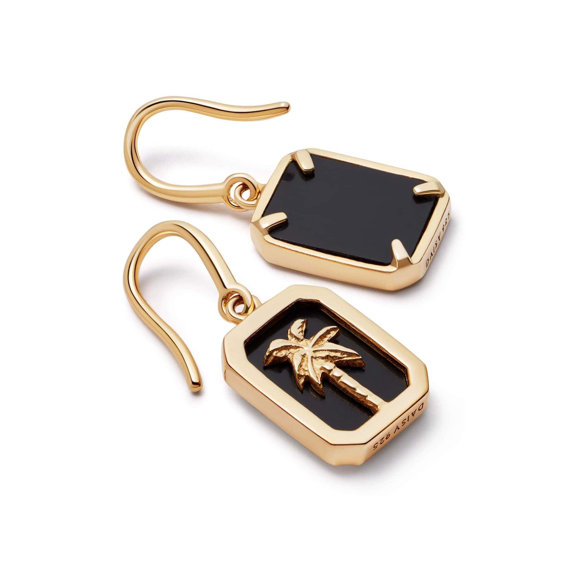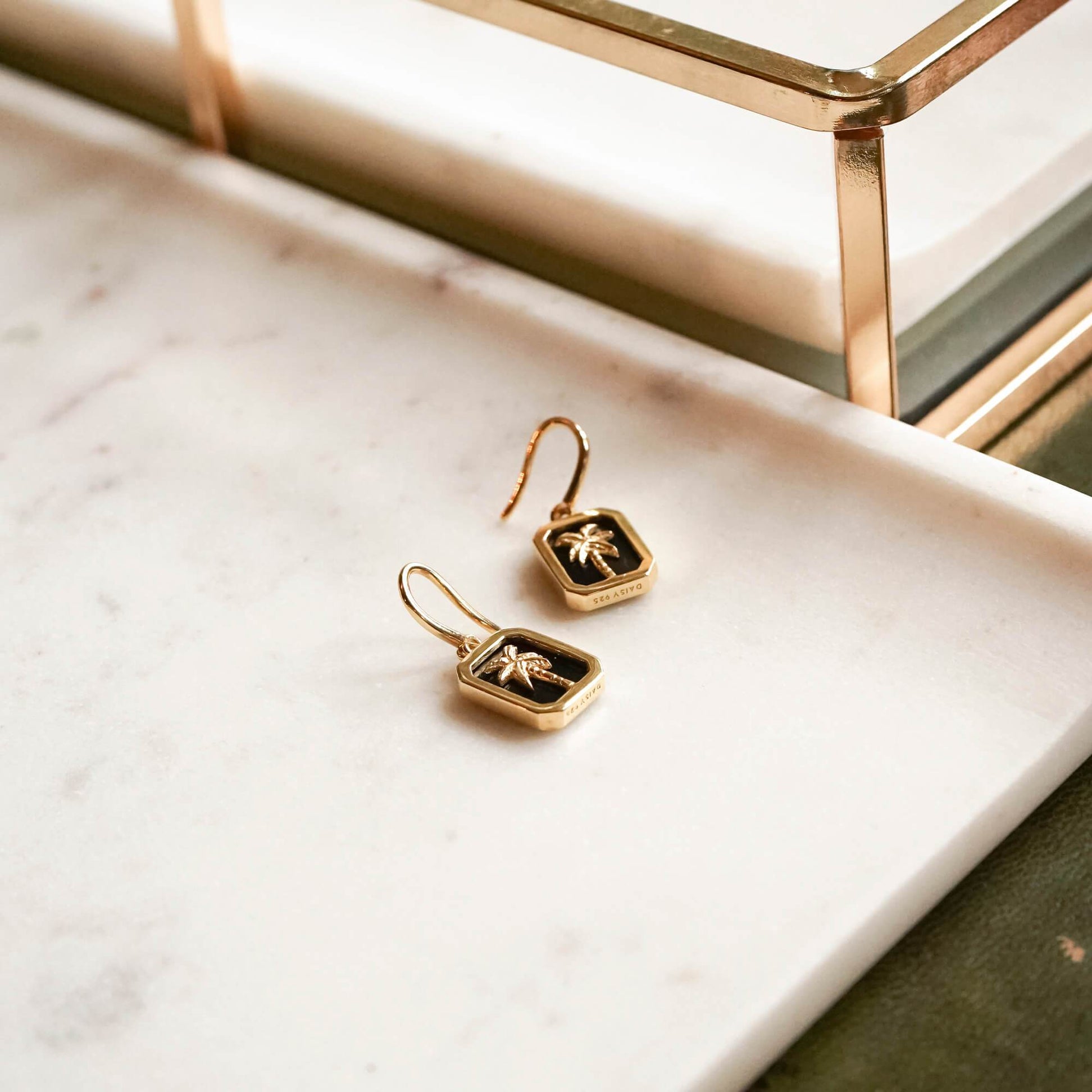 Inspired by old-school glamour the Palm Tree Earrings feature a beach palm motif set over black glass with an 18ct gold plate border. Talk about art-deco decadence! Style with another statement drop for a full glam ear look.