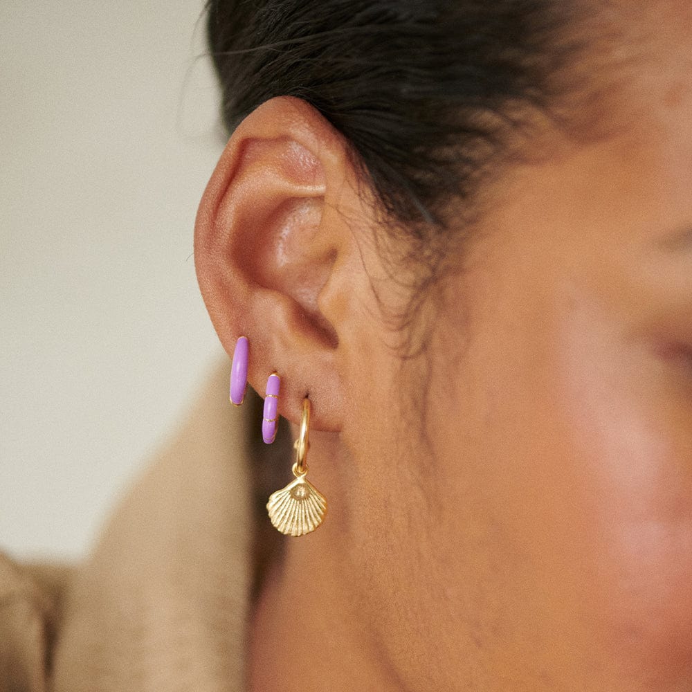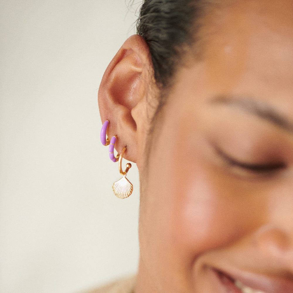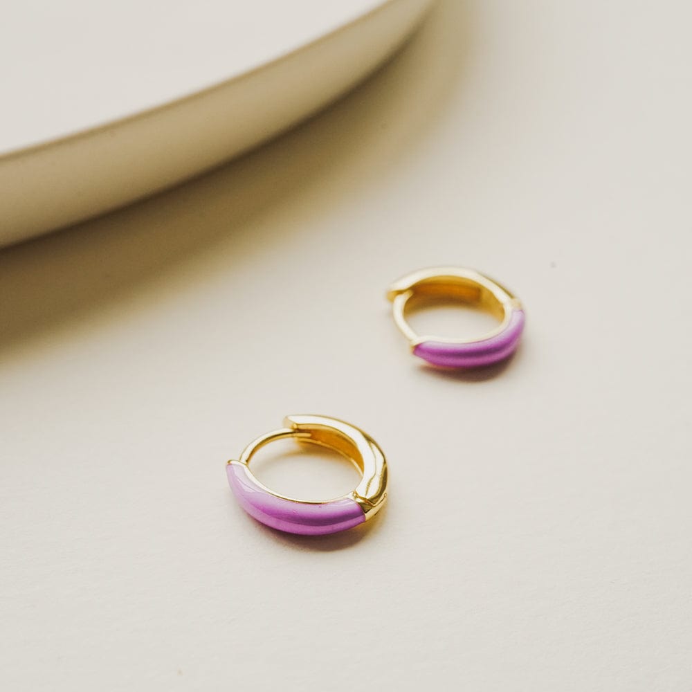 Keep it colourful with these mood boosting huggies. Coated in purple enamel and carefully crafted in 18ct gold plate. Style solo or with multiple hoops for an eye-catching stack.