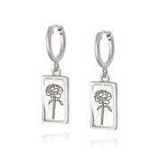 Long a symbol of devotion and passion, the rose is often used to communicate the emotion of love, picking up where words fail. Featuring a rectangular pendant with a delicate stamped rose illustration, this handcrafted 100% recycled sterling silver has a subtle matte finish and a pendant is hung from a small, elegant hoop.