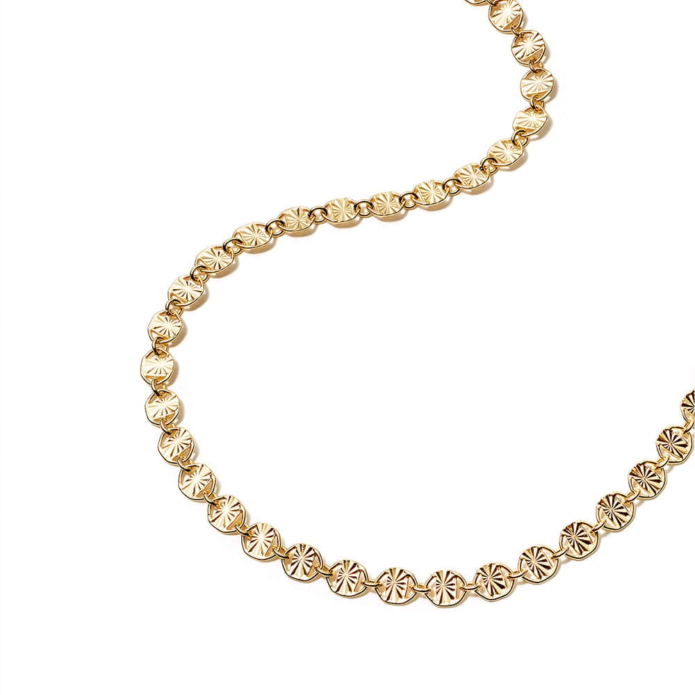 Catch the light wherever you go with this standout layering chain. Featuring the iconic Daisy sunburst pattern engraved on organic shaped links. Layer with a selection of delicate chains for an effortless look.