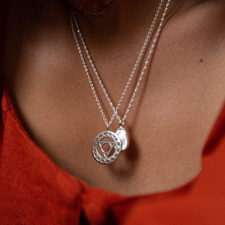 Choose the Chakra symbol that best represents your inner self. The Throat Chakra is emotionally connected with truthful expression, loyalty and organisation. Wear solo or layer with simple chains for an effortless stack with meaning.